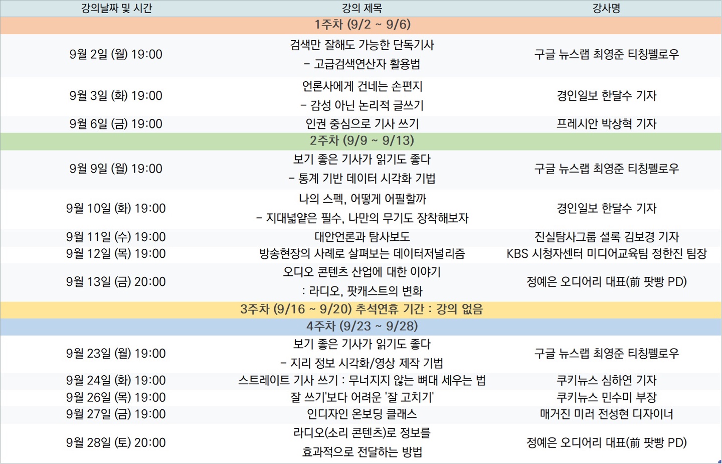 대학알리와 대학언론인 네트워크가 이번 가을 9/2-9/28 동안 대학언론인과 언론인 지망생을 대상으로 언론 관련 강의를 진행합니다
