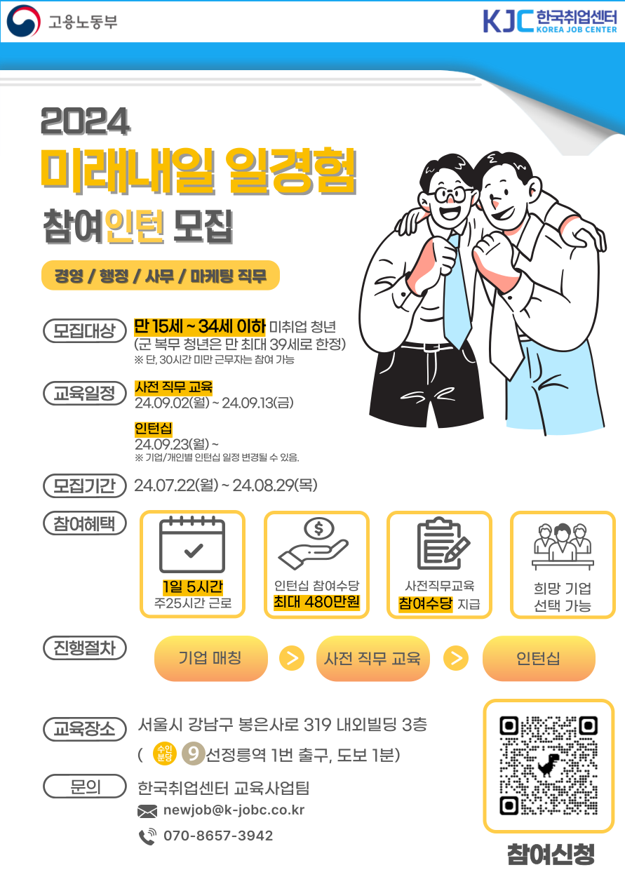 2024년 미래내일 일경험(인턴형 경영/사무/행정/마케팅 직무 1기)을 진행합니다.