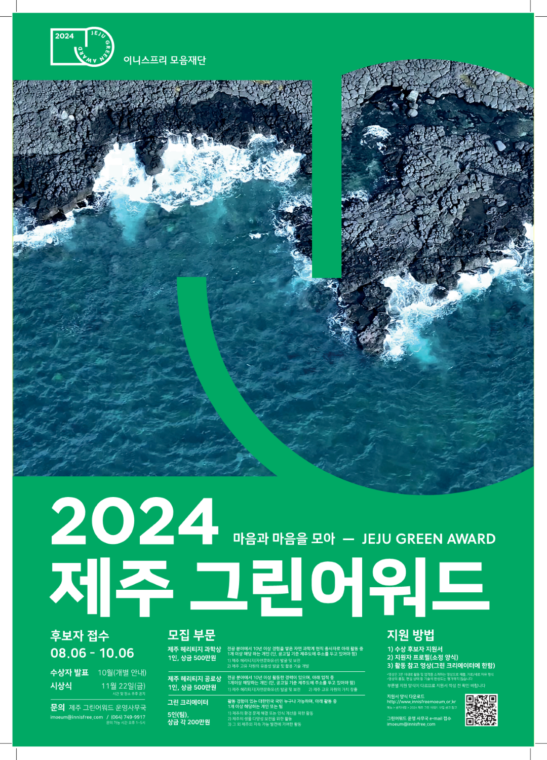 이니스프리 모음재단은 '제주의 지속 가능 발전'을 구현하는 지역문화 창달에 기여하고자 '2024 제주 그린어워드'를 개최합니다. 제주 헤리티지(자연·문화유산)의 보존 및 가치 제고를 위해 활동하는 개인 또는 단체를 선발하여 업적을 기리고자 다음과 같이 수상 후보자를 모집합니다. 각 분야에서 제주다움을 드높이기 위해 활발하게 활동하시는 분들의 지원 또는 추천을 부탁드립니다