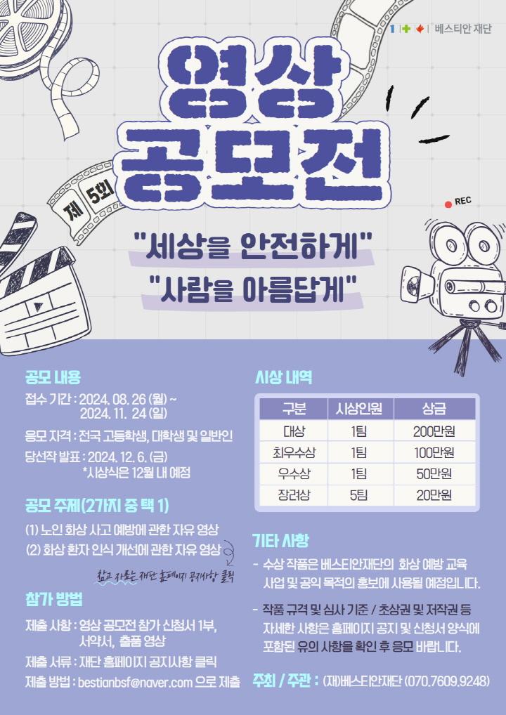 ‘세상을 안전하게, 사람을 아름답게’ 영상 공모전은 화상에 대한 부정적 인식개선과 화상 예방 교육 등 화상에 대한 국민적 이해와 관심을 높여 화상으로부터 안전한 세상을 만들기 위해 진행하는 공모전입니다.