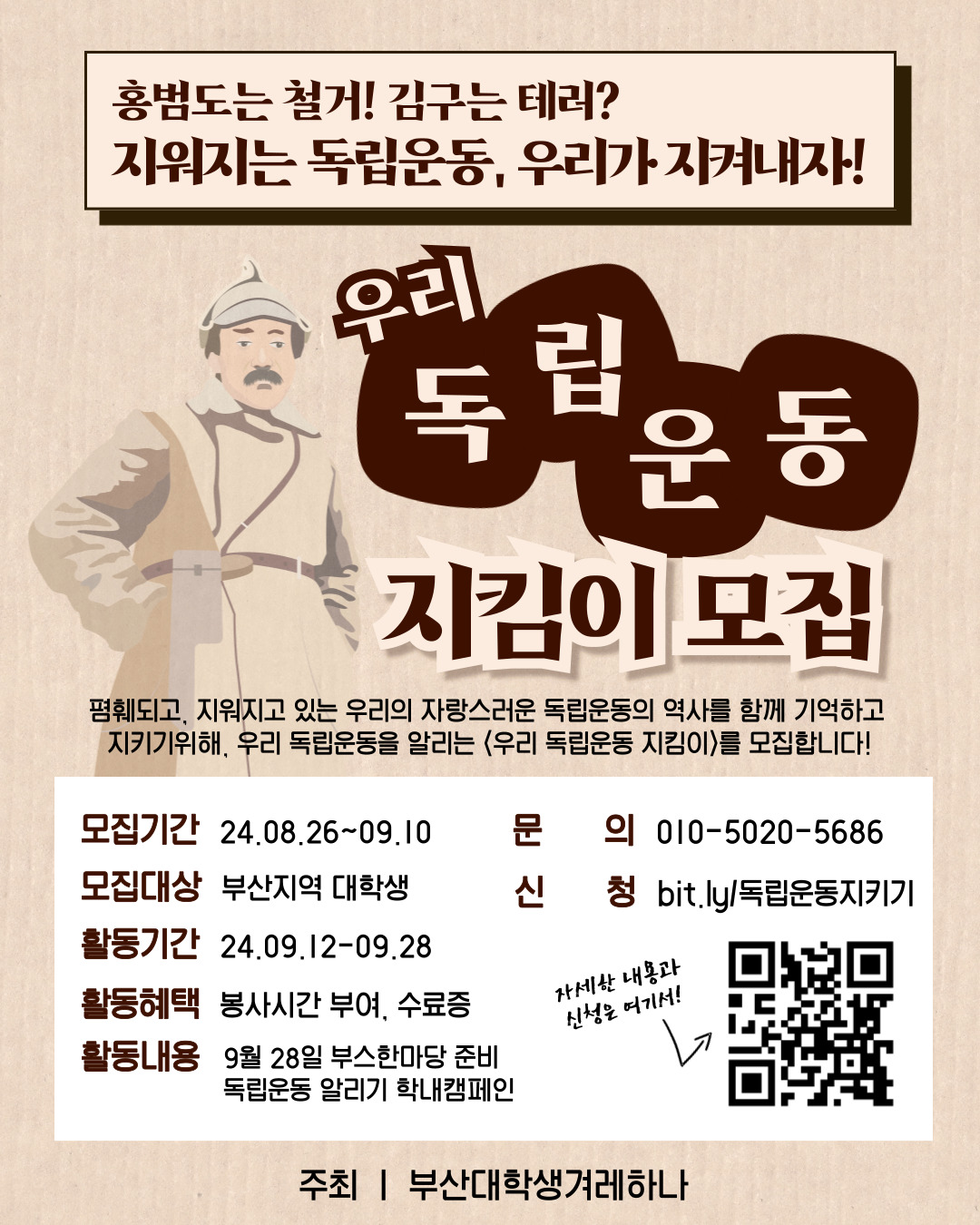 우리 역사를 배우고 실천하는, 부산지역 12개 대학교 연합동아리 '부산대학생겨레하나'에서 주최합니다.