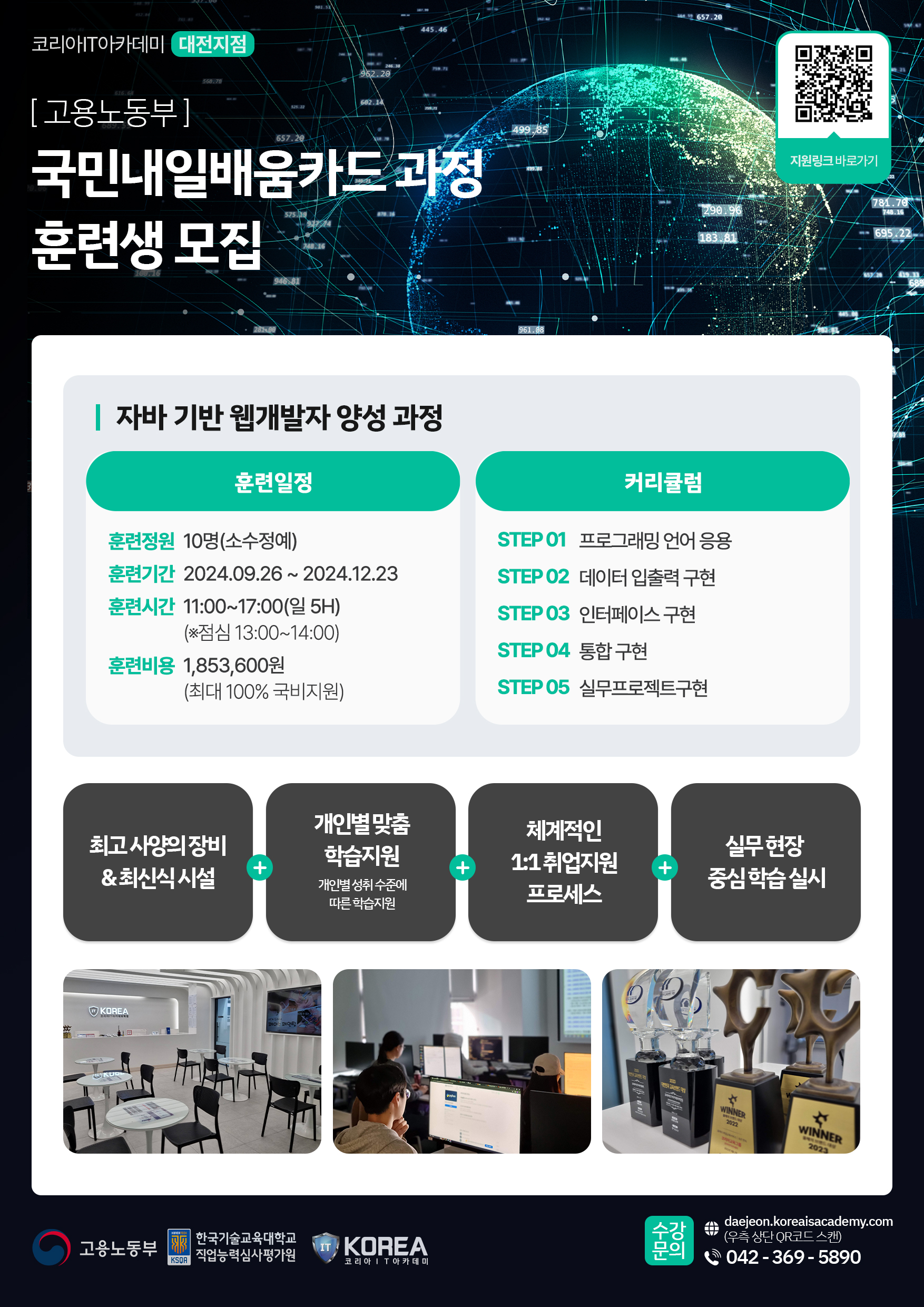 코리아IT아카데미 대전에서 IT 개발자 취업을 꿈꾸시는 분이면 관심 있으실만한 전액 무료 국비지원 수업이 있어 안내드립니다.