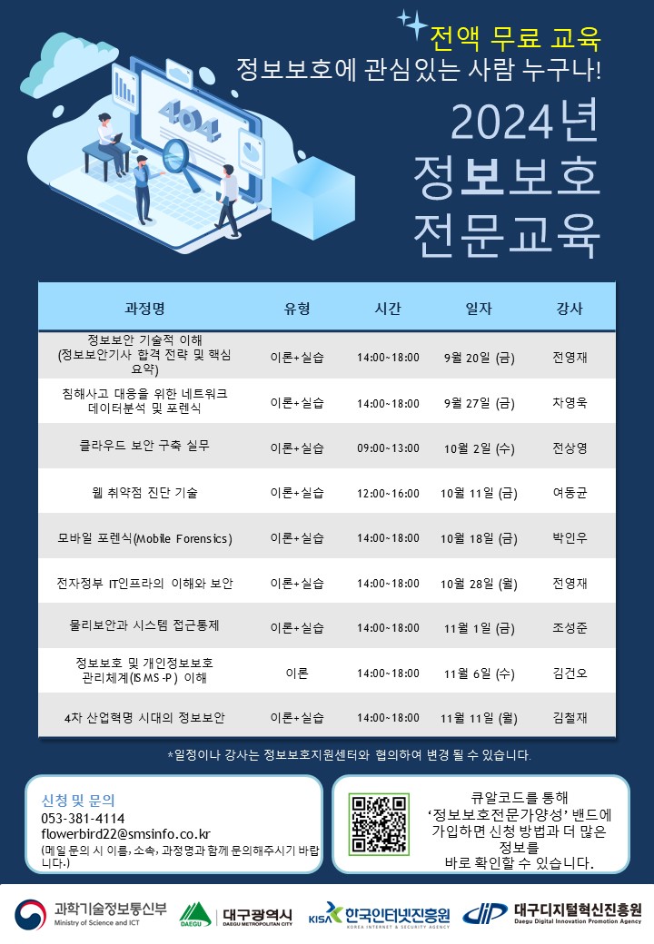 2024년 정보보호 전문교육을 9월 20일부터 11월 15일까지 매주 금요일 오후 2시에 대구디지털혁신진흥원에서 진행합니다.
