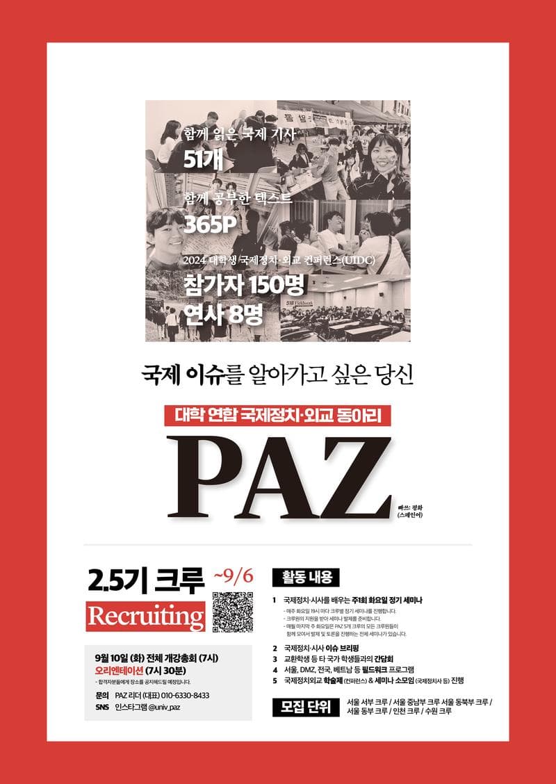 <대학 연합 국제정치·외교동아리 : Paz>에서 함께 할 2.5기 크루원을 모집합니다. ‘Paz’는 국제정치 이슈 세미나를 통해 국제질서가 전 세계에서 어떤 영향을 미치는지 정치﹒경제﹒외교 등 다양한 측면에서 분석하고, 평화적 해결책을 함께 모색하는 대학 연합 학술 동아리입니다. 국제뉴스부터 전공수업, 대외활동에도 도움이 되는 심도있는 내용까지 갖춘 PAZ에 많은 분들의 지원을 바랍니다!