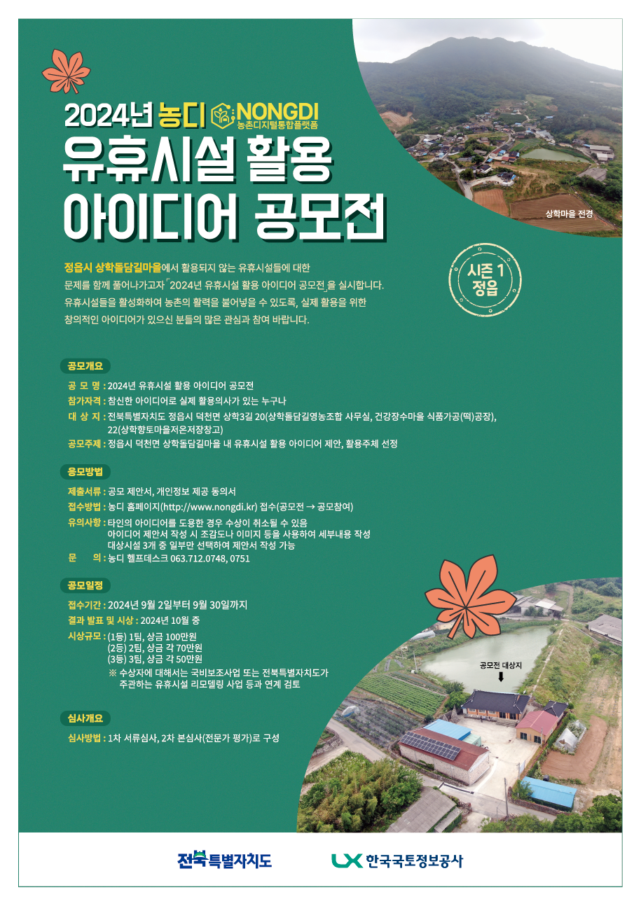 - 정읍시 상학돌담길마을에서 활용되지 않는 유휴시설들에 대한 문제를 함께 풀어나가고자 진행하는 공모전이며