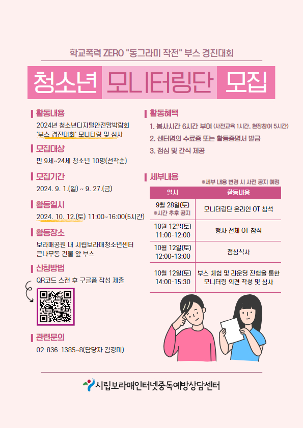 시립보라매인터넷중독예방상담센터에서는 2024 동작구 학교폭력 예방 ZERO "동그라미 작전" 청소년 사이버폭력(학교폭력) 예방 활동 부스 경진대회에서 ✨청소년이 직접 모니터링 의견을 제시하고 심사를 진행함으로써✨ 청소년 안전망 형성을 위한 청소년의 주도적인 참여 기회를 제공하고자 [청소년 모니터링 및 심사단]을 모집합니다.