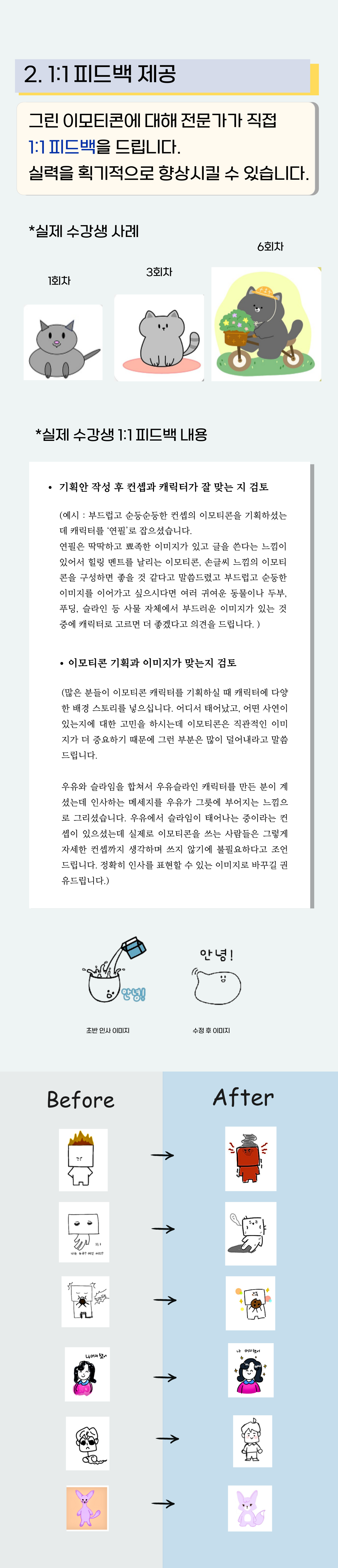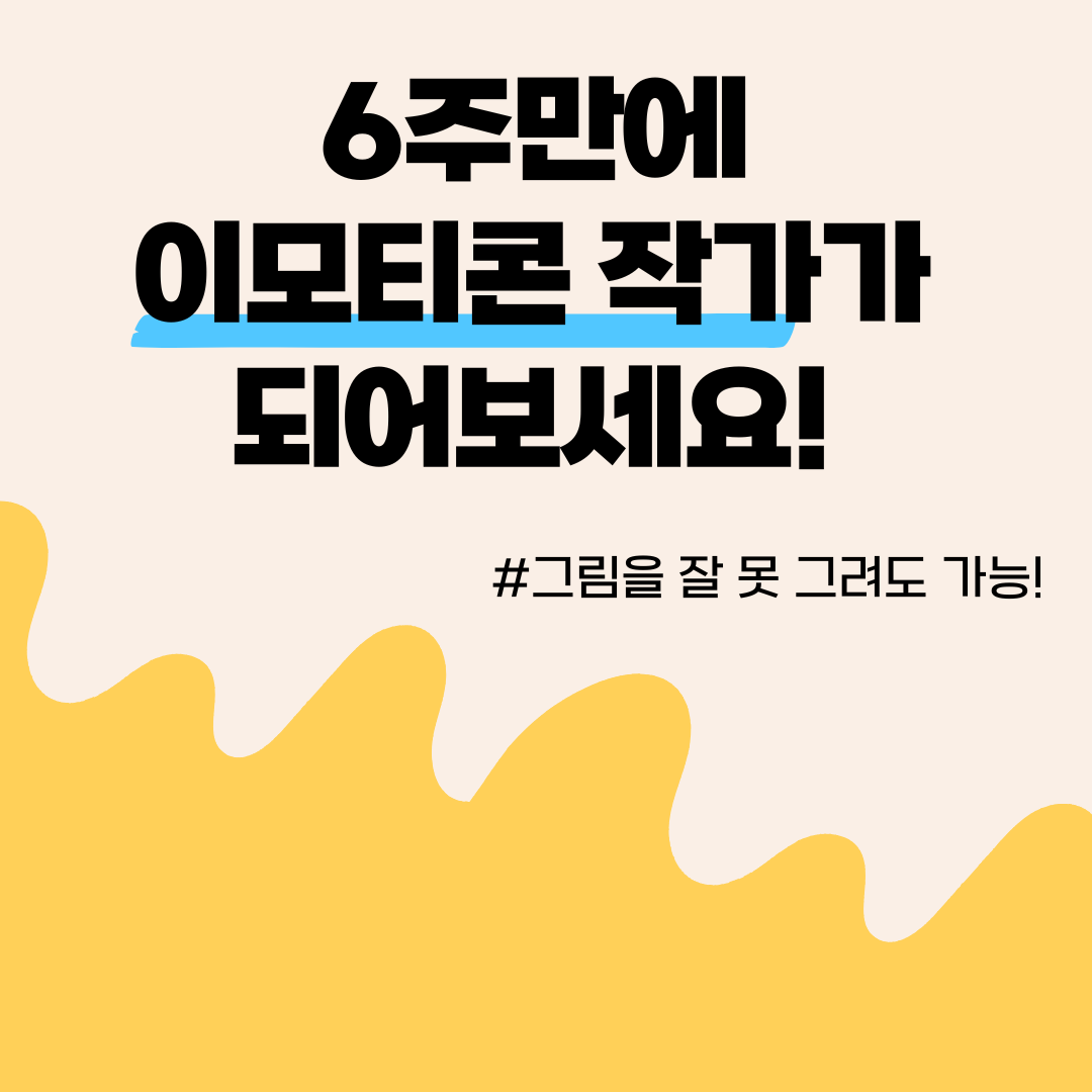 기존 강의의 문제점을 해결하기 위해, ‘6주만에 이모티콘 작가되기 (입문)’에서는 이론에 더해 실습세션과 전문가의 1:1 피드백을 진행합니다. 배운 내용을 내것으로 만들고, 제대로된 이모티콘을 만들기 위해서는 이 과정이 꼭 필요합니다. 또한 가이드를 따라오신 참여자분들에 대하여, 100% 결과물을 보장합니다.