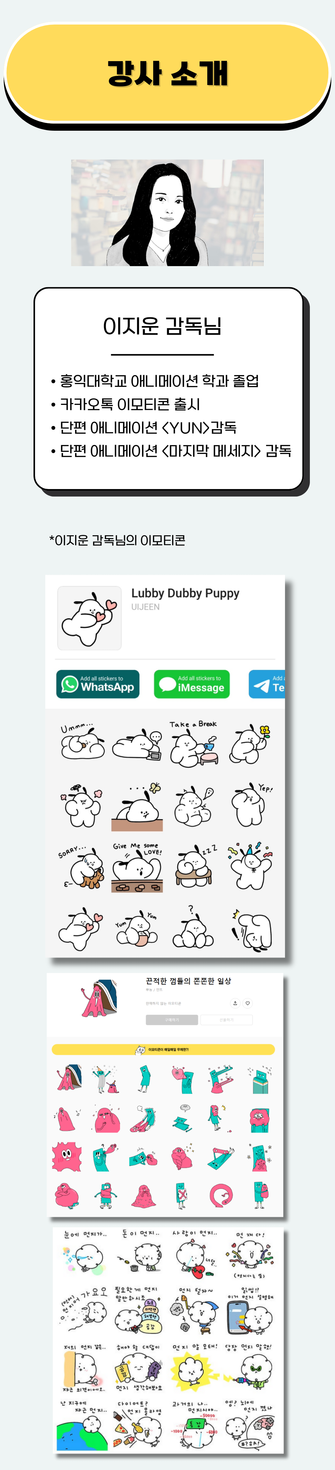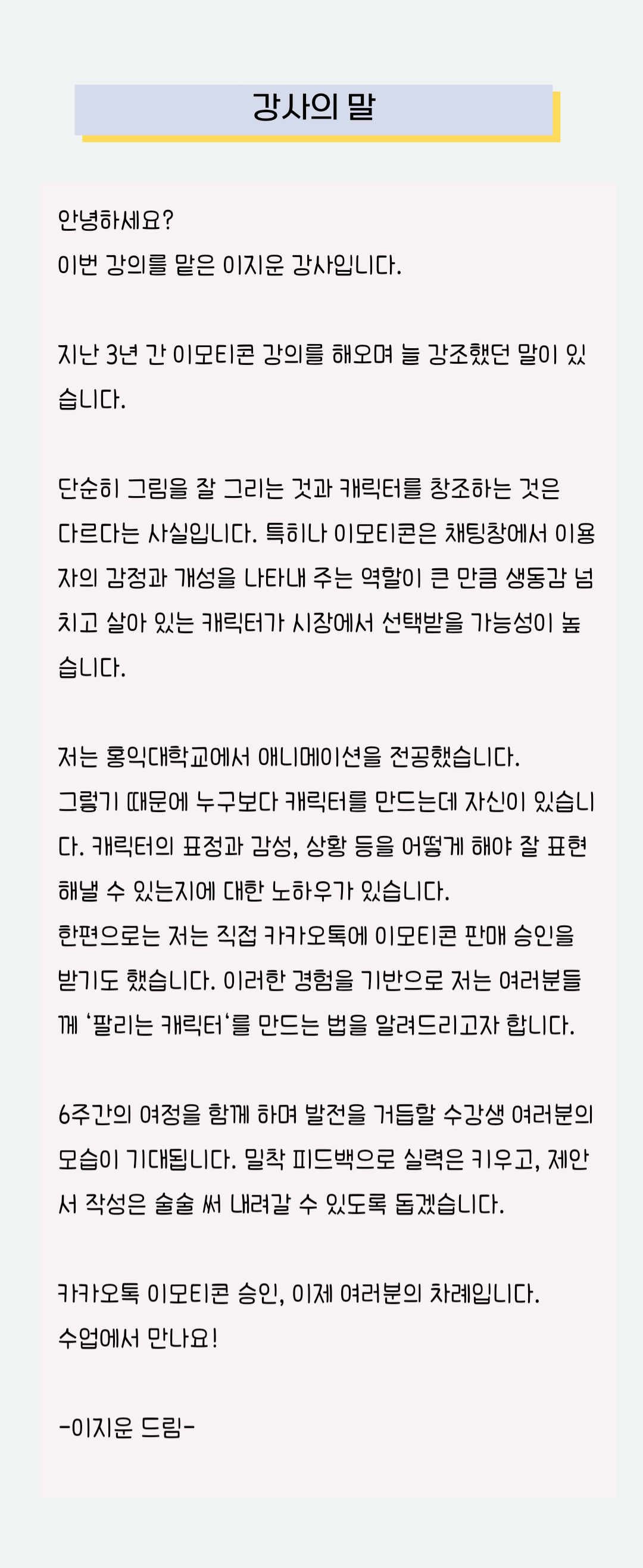 이미 시중에 이모티콘 강의는 많습니다. 그러나 대다수 강의는 이모티콘을 만드는 이론만 알려주는데에서 그쳐, 막상 그려보려고 하면 막막한 경우가 많았습니다.