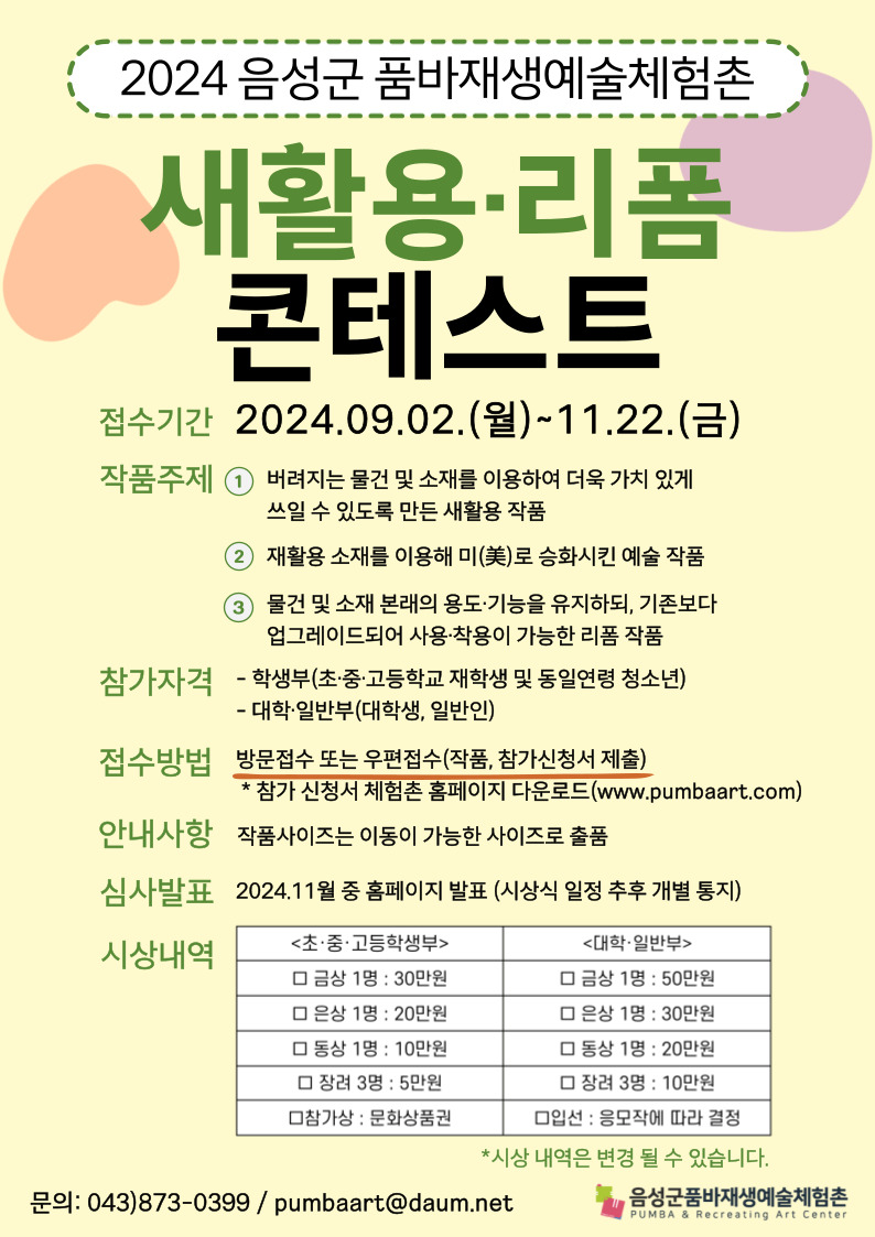 • 전시 계획 : 제출한 작품은 품바재생예술체험촌 2024년 새활용·리폼 콘테스트 수상작 전시회에 전시됩니다.