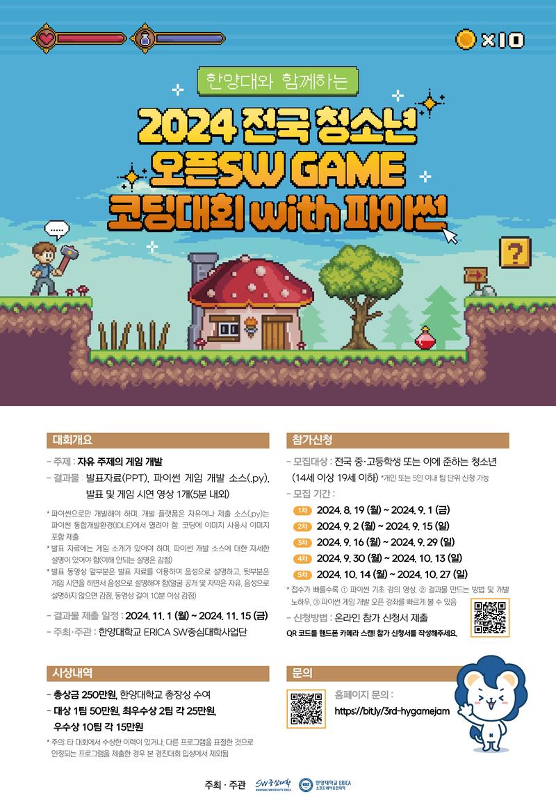 - 대회명: 한양대와 함께하는 "2024 전국 청소년 오픈SW GAME 코딩대회 with파이썬