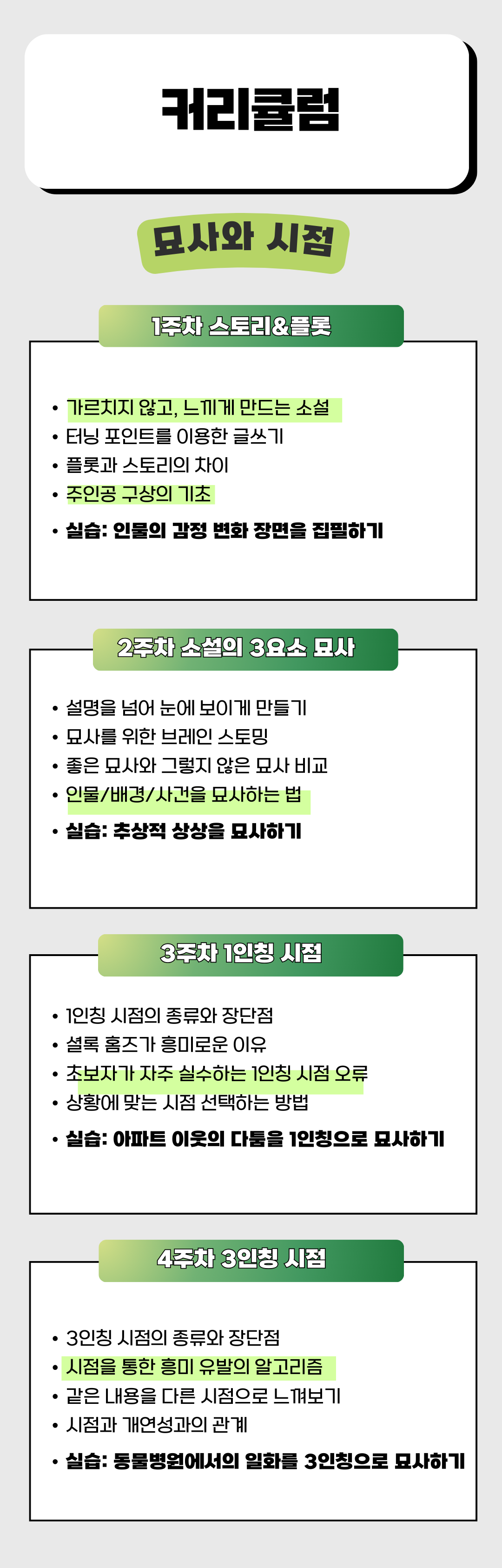 • 작필 소설 초급반은 ‘묘사와 시점’과 ‘문장력과 글 구성’ 프로젝트가 번갈아 가며 개설됩니다. 각각 4주 과정으로, 가볍게 시작하실 수 있도록 나누어 구성하였습니다.