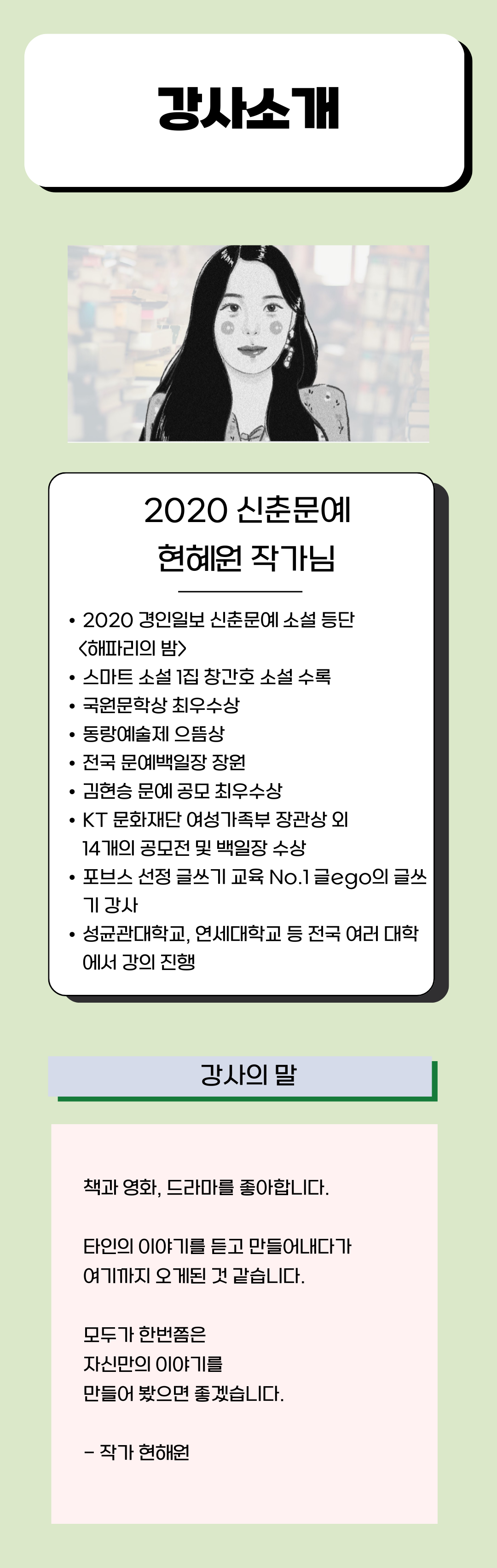 제대로 소설 쓰기를 배우고, 소설가의 첫 스텝을 밟고자 하시는 분들께 이 프로그램을 추천드립니다.