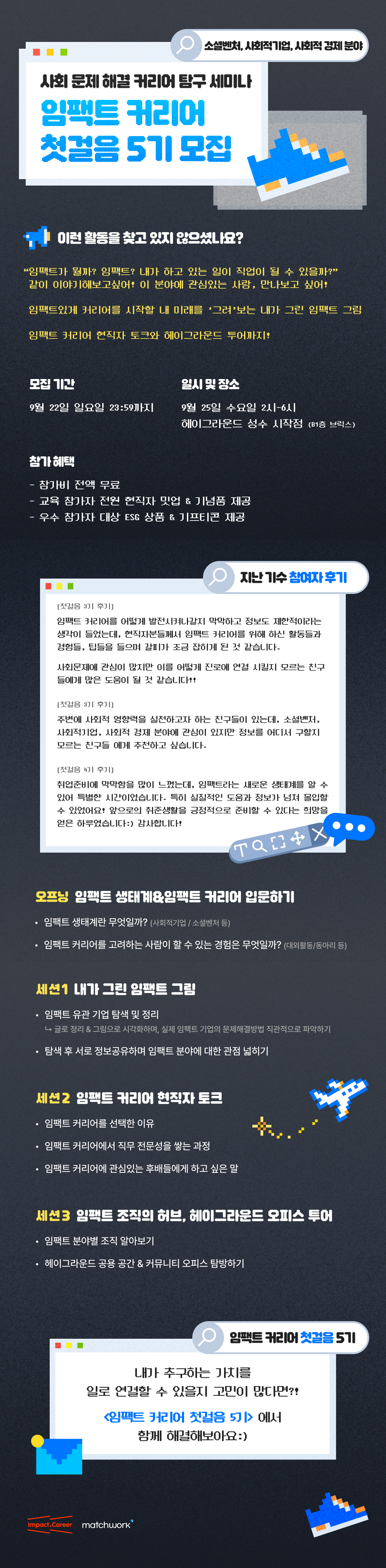 평소 사회 문제에 관심 있거나, 의미 있는 일을 커리어로 만들어가는 임팩트 커리어와 업계에 대해 궁금했다면 주목!