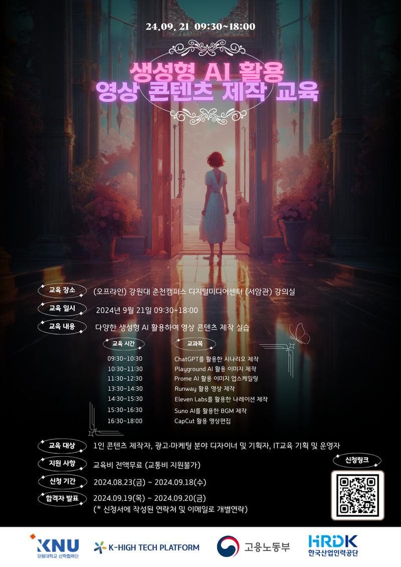 여러분의 상상력을 현실로 만드는 기회를 놓치지 마세요! 최첨단 생성형 AI를 활용한 영상 콘텐츠 제작 교육과정을 소개합니다.