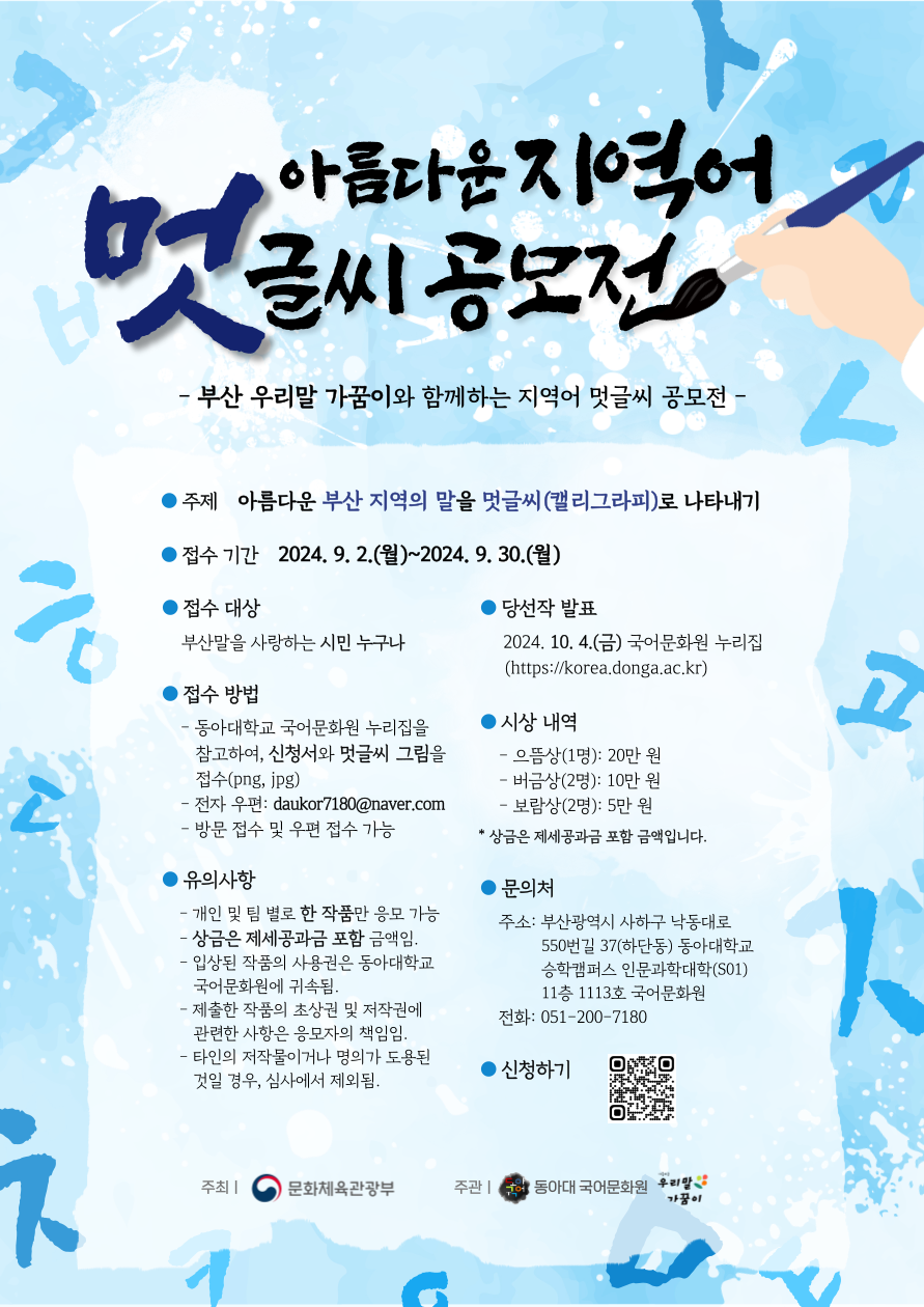 5. 당선작 발표: 10월 4일(금) 동아대학교 국어문화원 누리집(https://korea.donga.ac.kr) 참고.