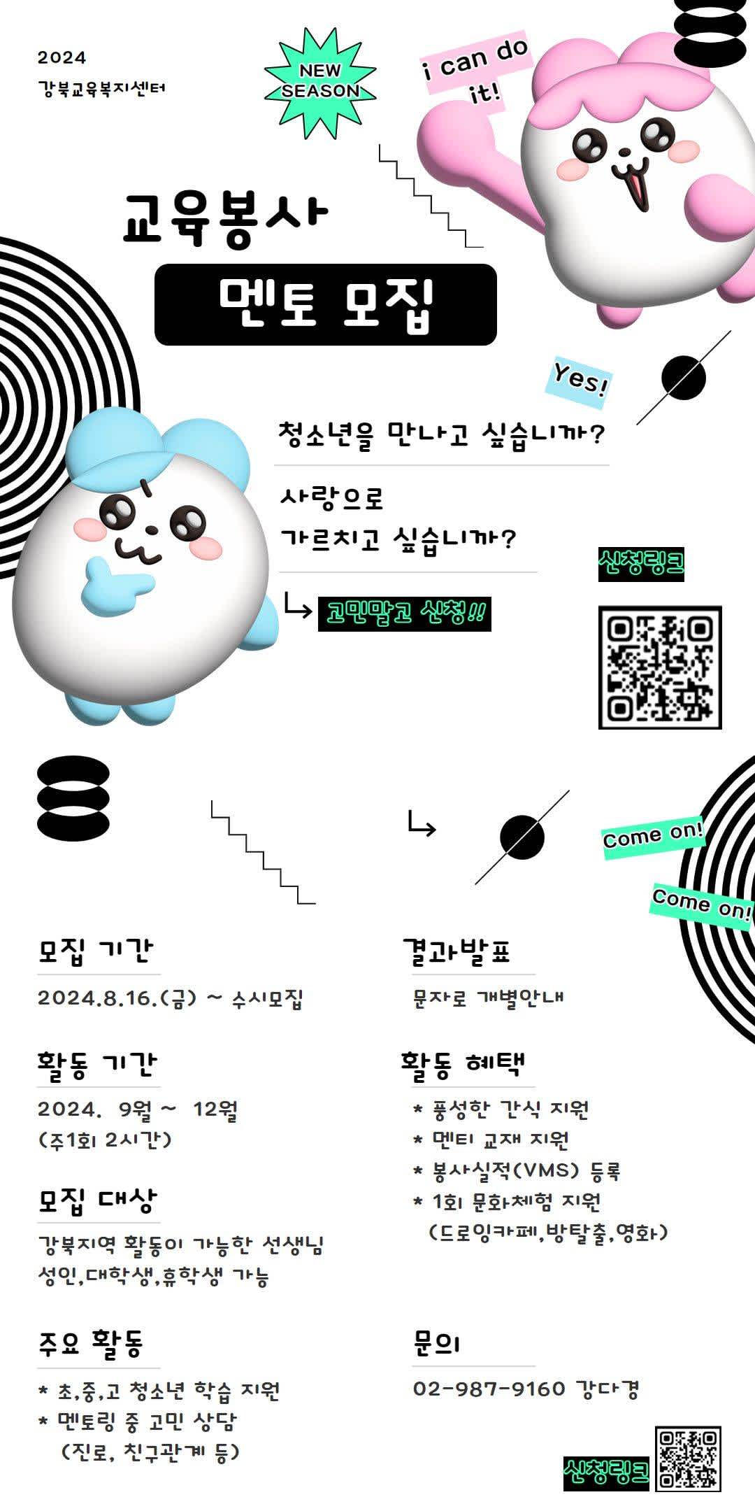 2024년 강북교육복지센터 학습 멘토링 멘토 자원봉사자 모집