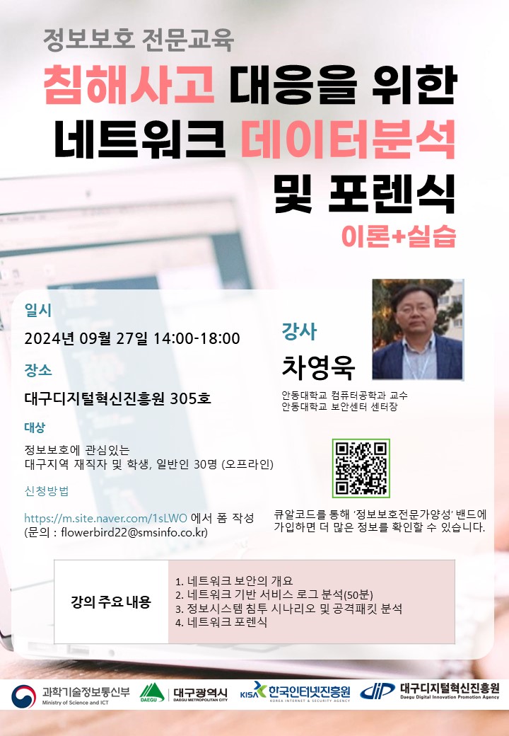 9월 두번째 강의인 침해사고 대응을 위한 네트워크 데이터 분석 및 포렌식 의 수강신청을 받고 있습니다.