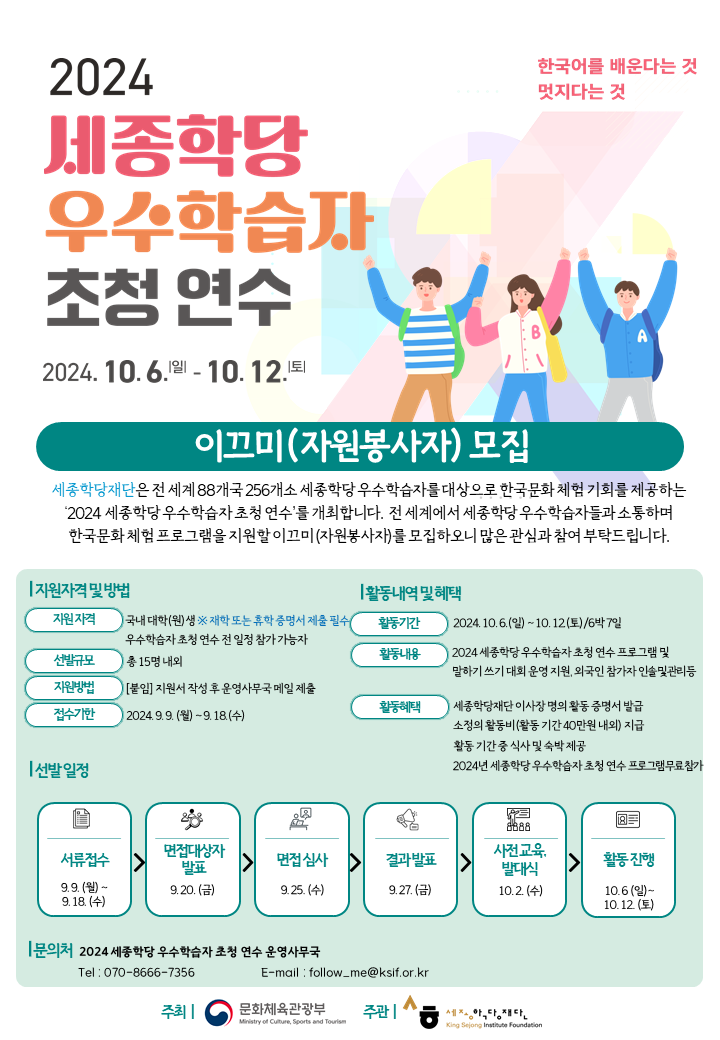 2024 세종학당 우수학습자 초청 연수 대학생 자원봉사자 모집 안내