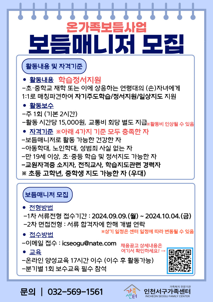 [인천서구가족센터] 온가족보듬사업 보듬매니저 모집공고