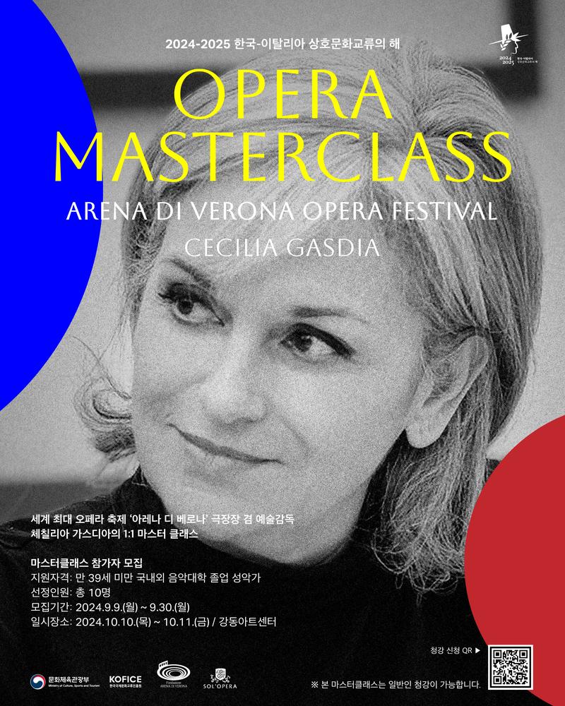 한국국제문화교류진흥원은 ‘2024-2025 한국-이탈리아 상호문화교류의 해’계기로 양국 오페라 예술인들의 교류를 증진하는데 좋은 기회를 마련하고자 세계 최대 오페라 축제‘아레나 디 베로나’체칠리아 가스디아 극장장 겸 예술감독과 함께하는 오페라 마스터클래스 진행합니다. 역량 있는 젊은 성악가들의 많은 지원 바랍니다.