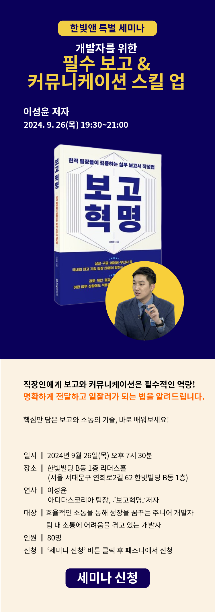 이번 세미나는 개발자를 대상으로 효과적인 보고와 커뮤니케이션 스킬을 향상시키는 방법을 다룹니다.