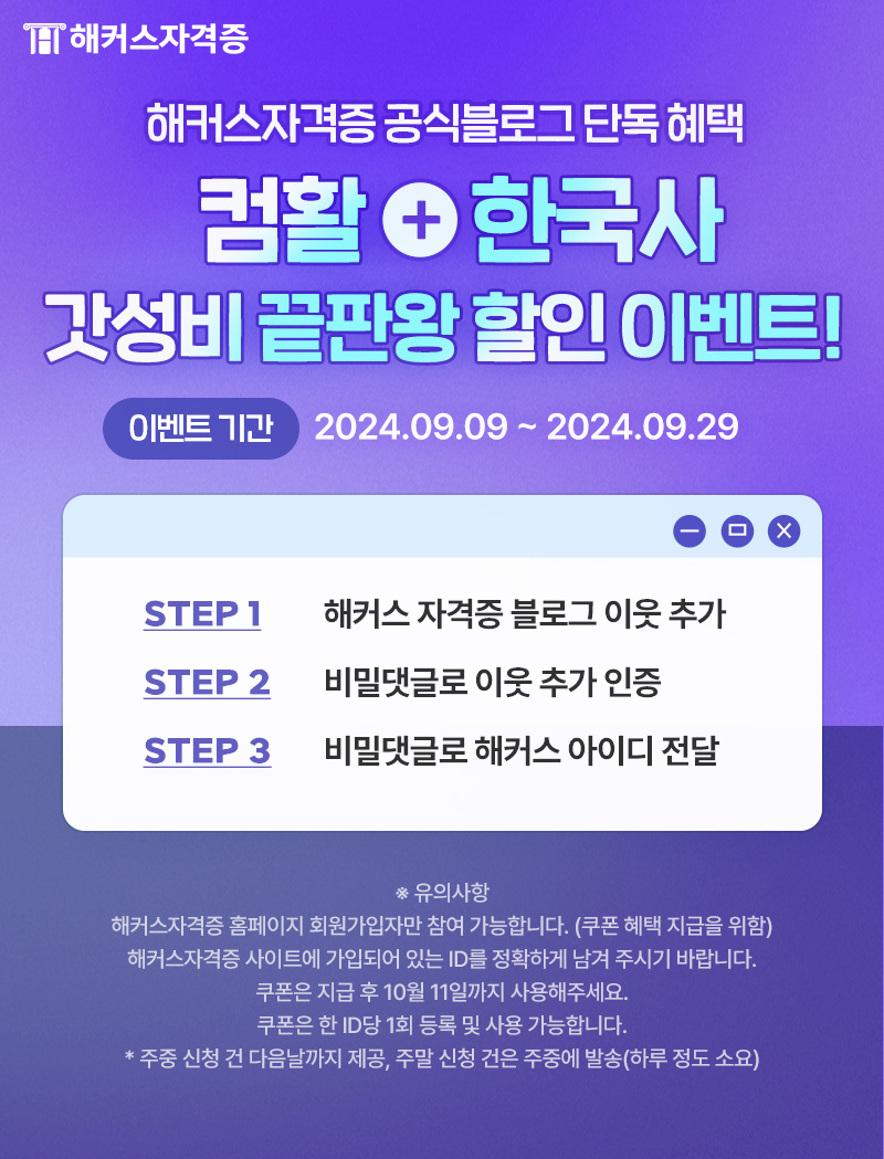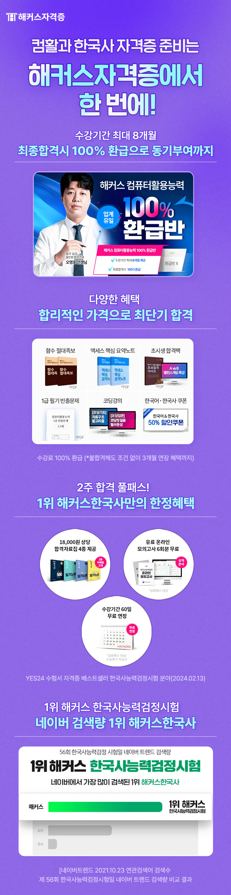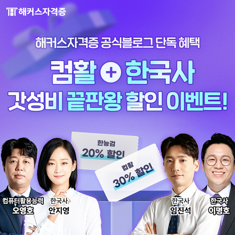 해커스자격증 컴활,한국사(한능검) 최대 50% 할인 이벤트! 하반기 취업 자격증 취득하기