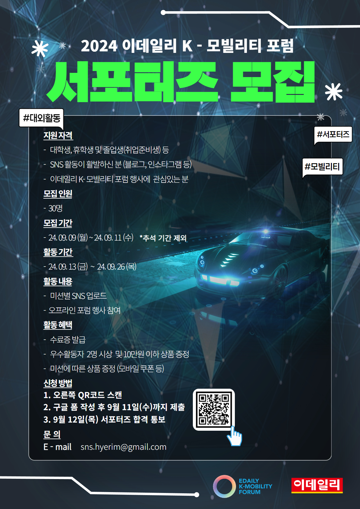 6) 신청 방법 : QR코드 스캔하여 구글 폼 작성 → 9월 11일(수)까지 제출 → 9월 12일(목) 서포터즈 합격 통보