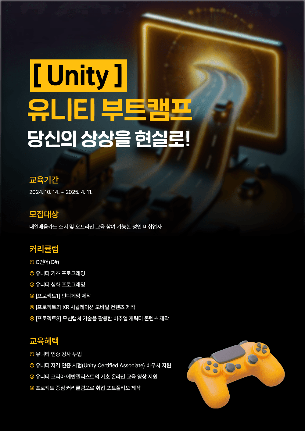 국민내일배움카드 발급이 가능하며 100% 오프라인 교육 참여가 가능한 유니티 엔진 관련 분야 취업을 희망하는 미취업자