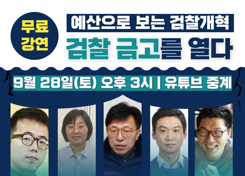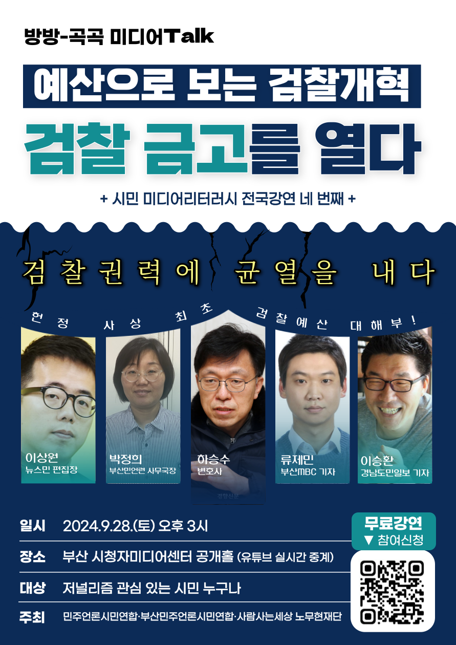 민주언론시민연합은 예산검증으로 검찰 금고를 연 주인공들을 초청해 2024년 9월 28일(토) 오후 3시, 부산시청자미디어센터에서 ‘예산으로 보는 검찰개혁, 검찰 금고를 열다’ 강연을 엽니다. 부산민언련, 노무현재단과 함께 진행하는 이번 강연에는 국민의 알권리 실현, 정부 투명성 강화, 검찰개혁 계기로 검찰 예산공개 및 검증 프로젝트를 이어온 하승수 세금도둑잡아라 공동대표, 류제민 부산MBC 기자, 이상원 뉴스민 기자, 이승환 경남도민일보 기자가 패널로 나섭니다. 박정희 부산민언련 사무국장이 사회를 맡아 검찰권력에 균열을 낸 이들의 다채로운 이야기를 듣습니다.
