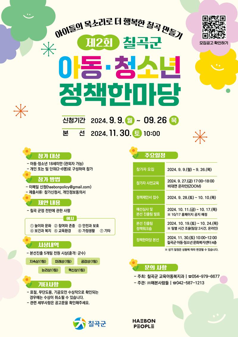 「칠곡군 아동·청소년 정책한마당」은 다양한 영역에서 아동 자신과 또래가 겪는 불편을 해결하기 위하여 관련된 정책을 직접 제안하는 사회참여 공모전입니다!