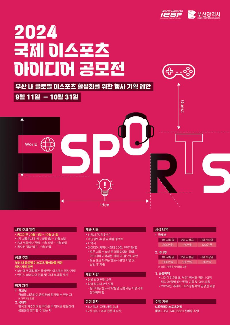 본 공모전은 부산광역시의 지원을 받아 수행하는 국제이스포츠R&D센터운영 위탁 사업의 일환입니다