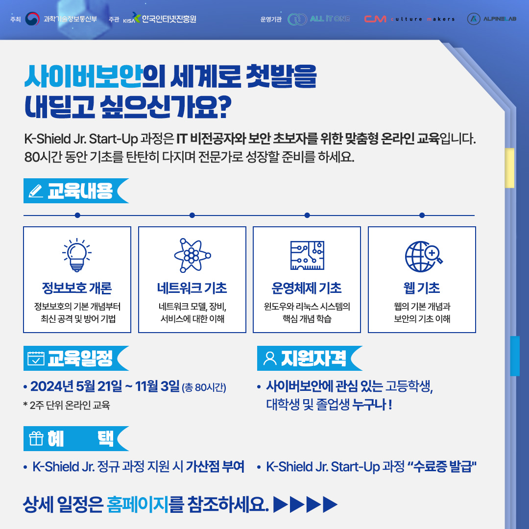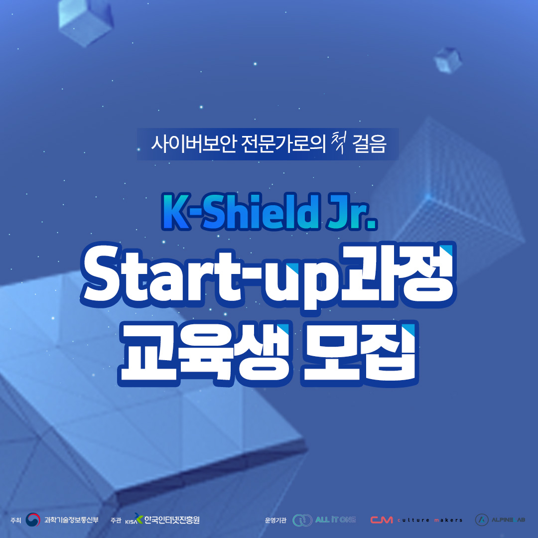 케이쉴드주니어란 사이버보안 인력양성 과정으로 과학기술정보통신부가 주최하고 한국인터넷진흥원이 주관하는 국내 최고의 교육과정입니다.