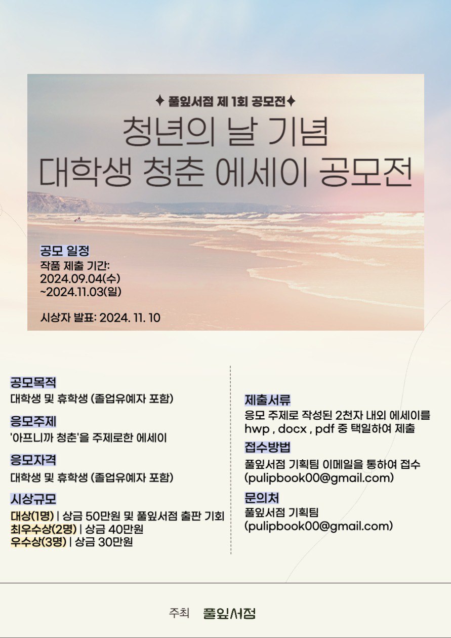 - 에세이를 작성하여 풀잎서점 기획팀 이메일(pulipbook00@gmail.com)을 통하여 접수