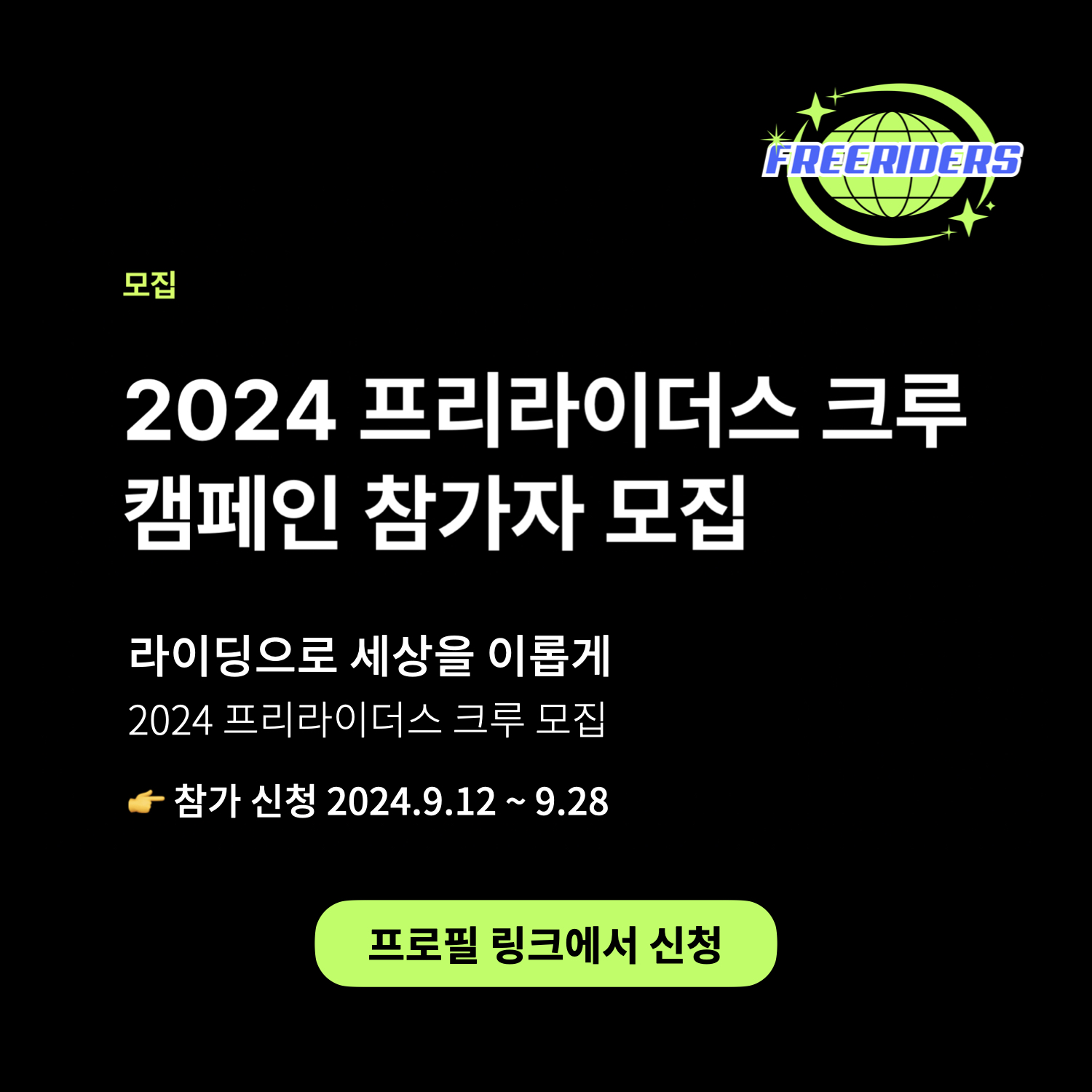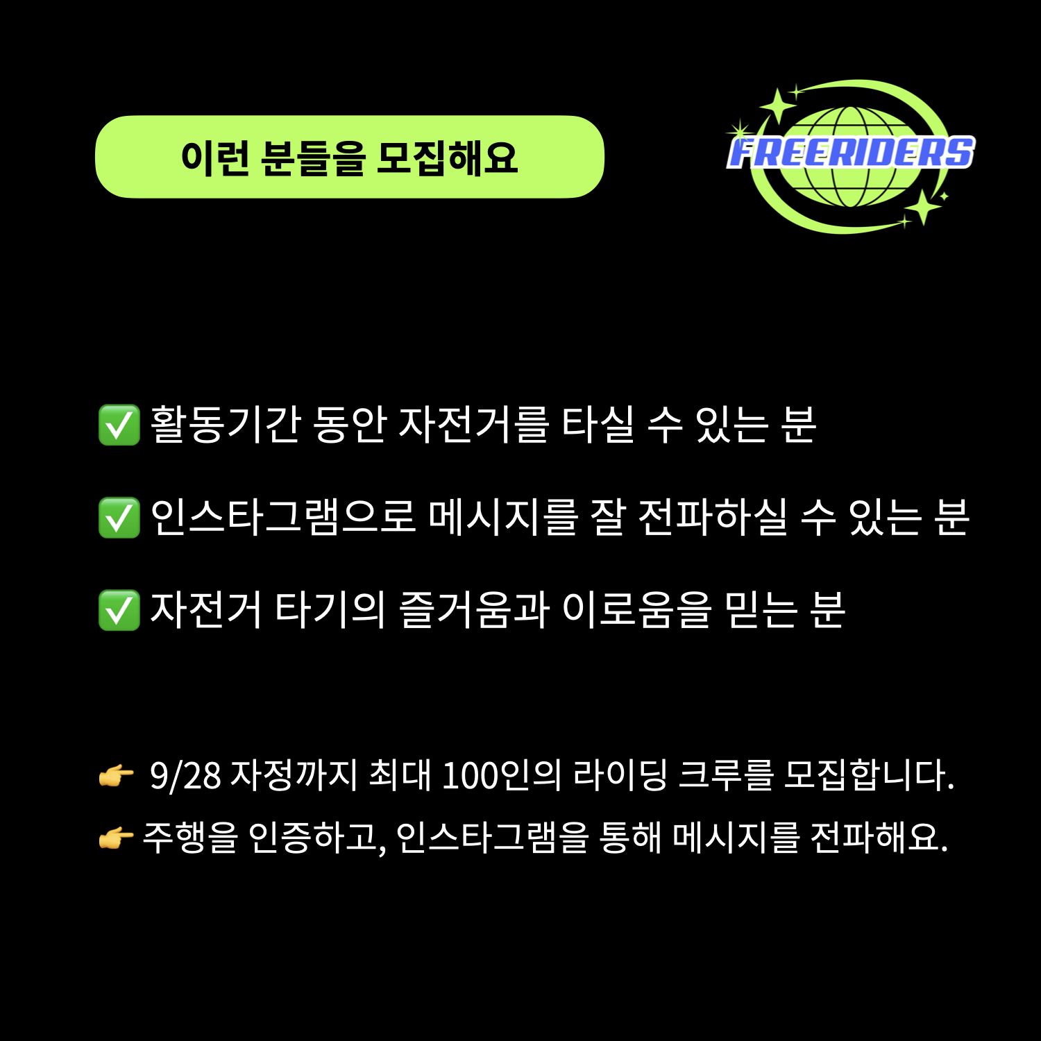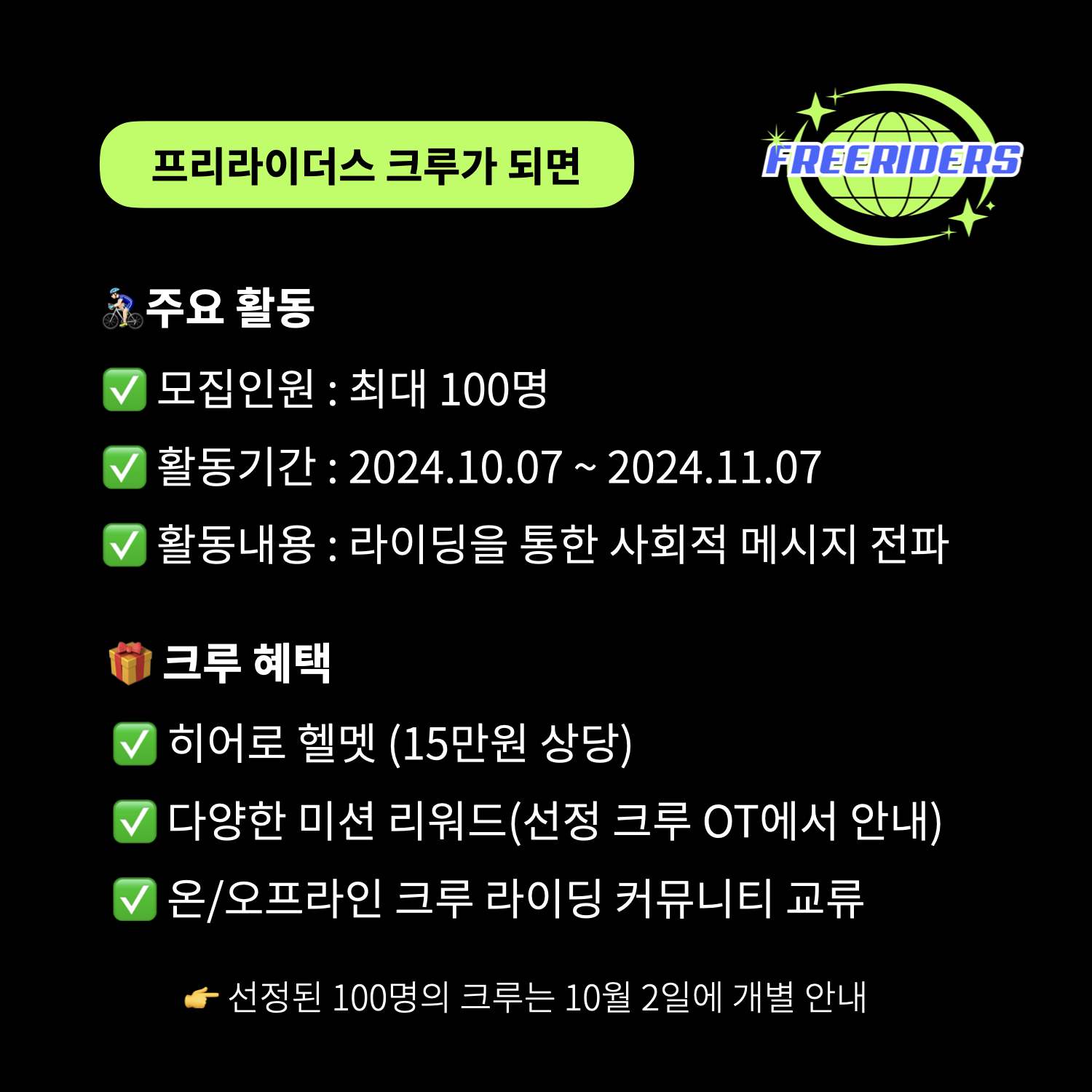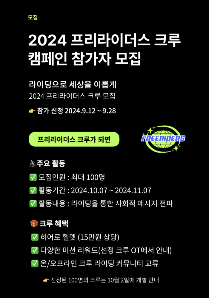 라이딩으로 세상을 이롭게 만들어나갈 라이딩 크루 100명 모집!