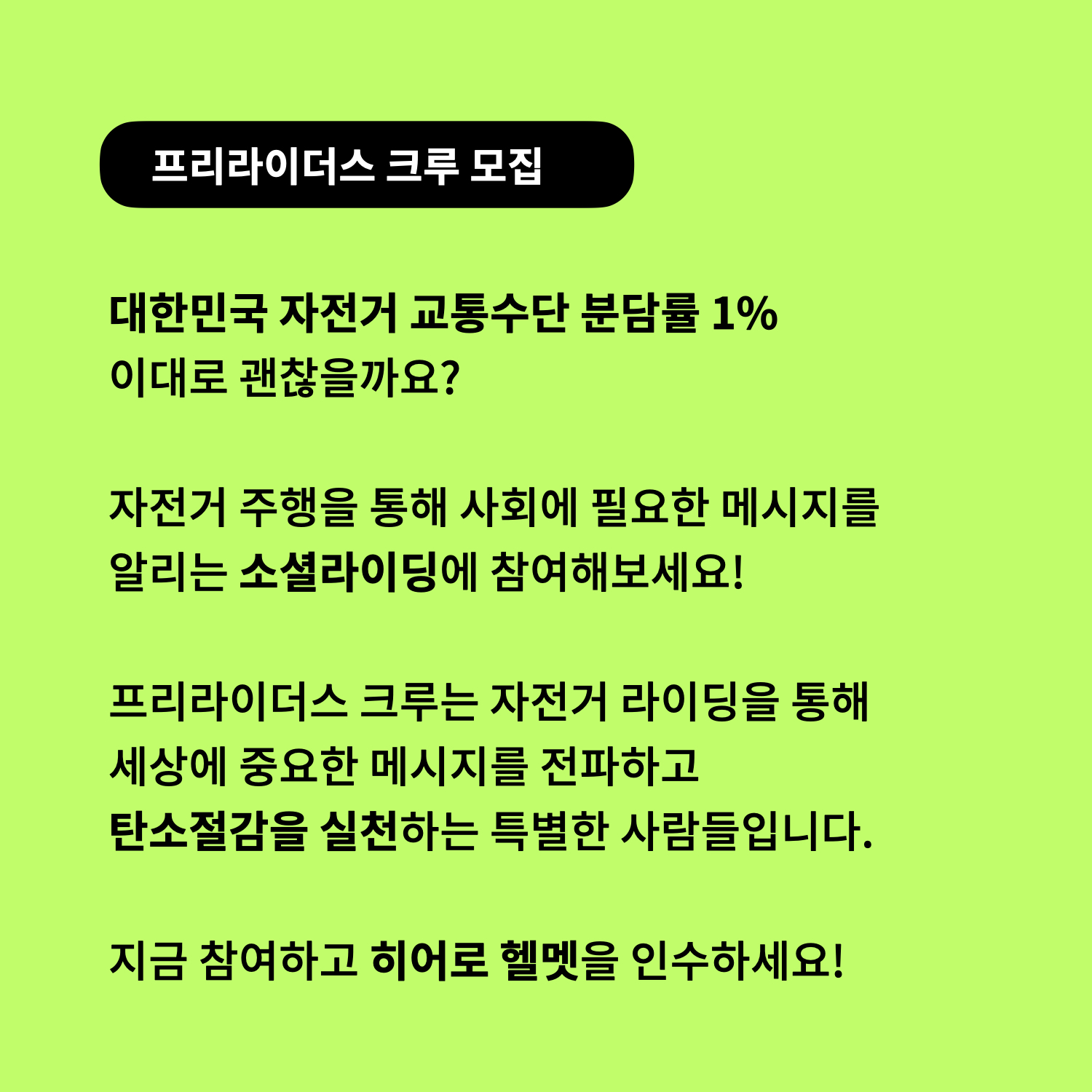 프리라이더스 크루는 자전거 라이딩을 통해 탄소 절감을 실천하고, 세상에 중요한 메시지를 전파하고 탄소 절감을 실천하는는 특별한 사람들입니다. 지금 참여하고 히어로 헬멧을 인수하세요!