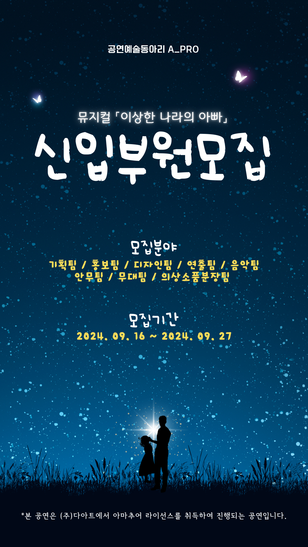 2024 하반기 공연으로 라이선스 뮤지컬 <이상한 나라의 아빠>를 함께 만들어 갈 신입부원을 모집합니다.
