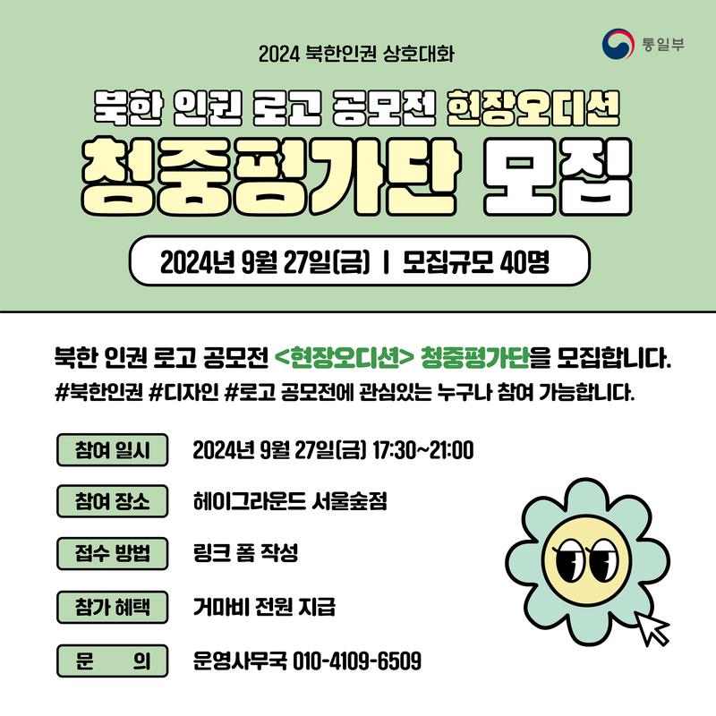 통일부에서는 북한인권 관련 쟁점에 대한 젊은 세대 등 시민사회 내 상호이해 증진 및 공감대 형성을 위한 <북한 인권 로고 공모전> 현장오디션에 청중평가단을 모집합니다.