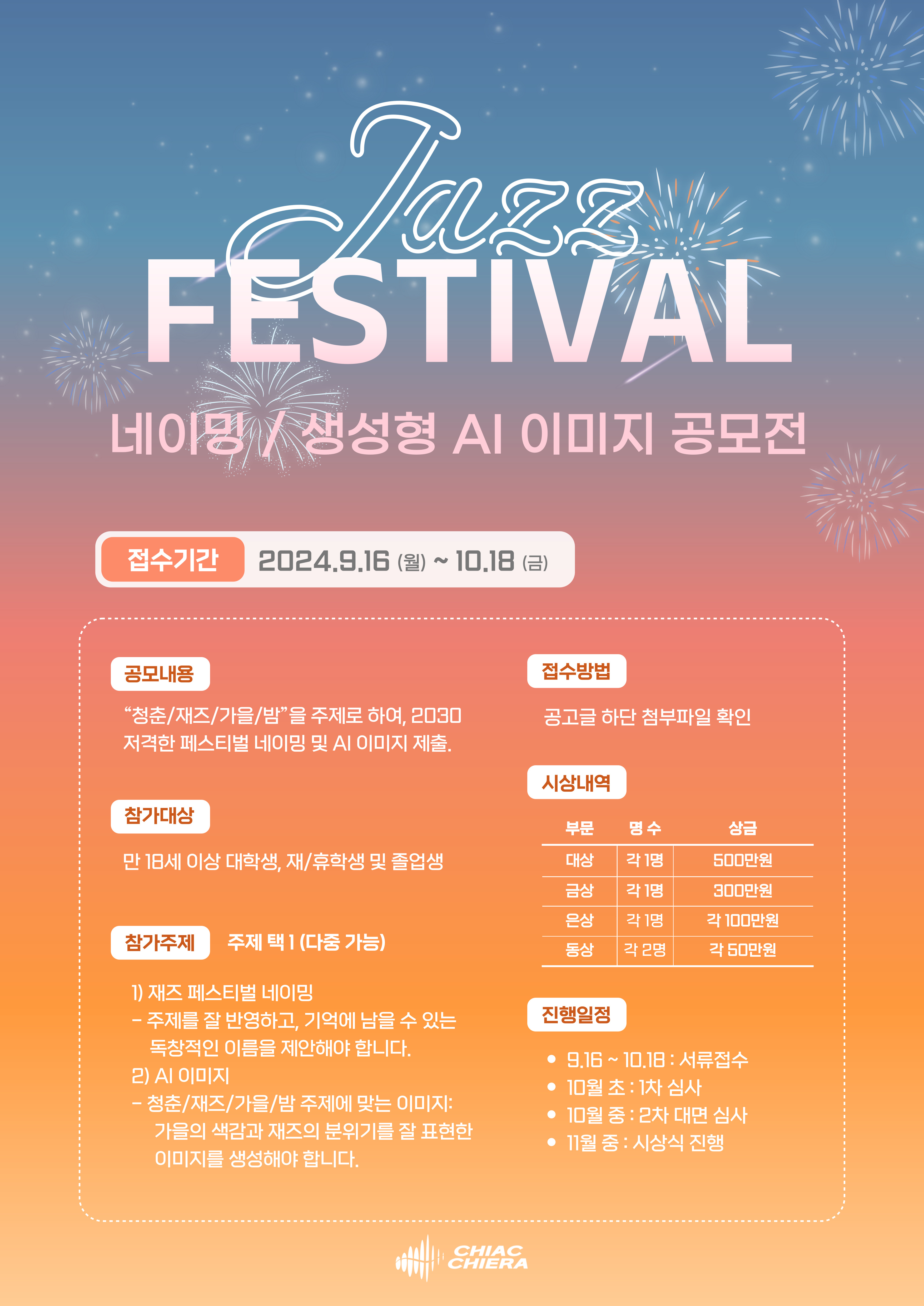 이 공모전은 청춘과 재즈, 가을의 조화를 통해 2030 세대의 감성을 자극하는 페스티벌을 기획하는 데 중점을 두고 있습니다. 창의적이고 매력적인 네이밍과 이미지를 통해 많은 참여 바랍니다.