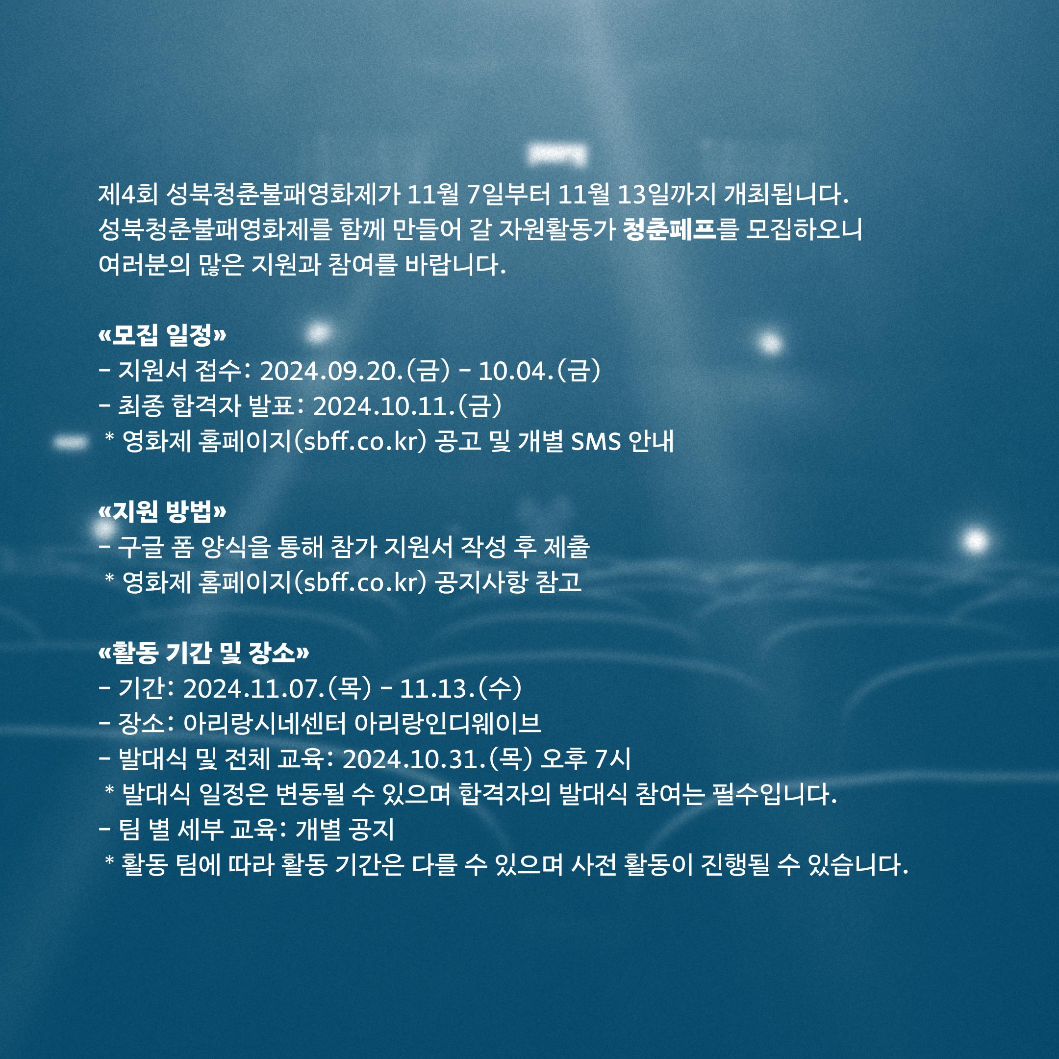 ※ 자세한 사항은 성북청춘불패영화제 홈페이지(sbff.co.kr) 공지사항을 참고해주시길 바랍니다.