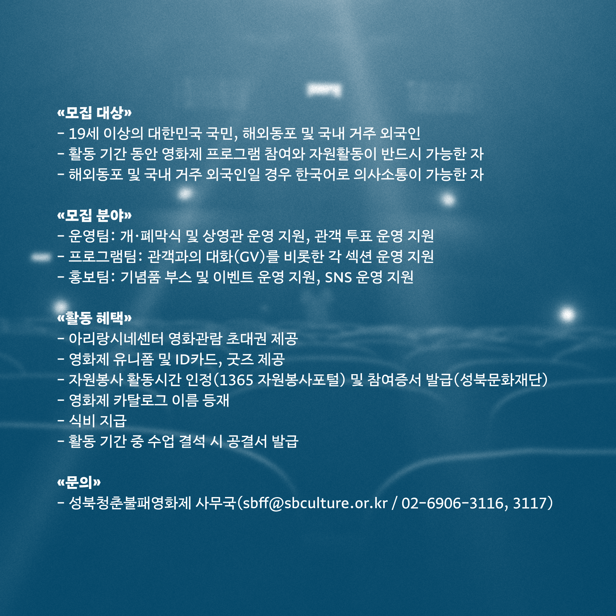 성북청춘불패영화제 사무국(sbff@sbculture.or.kr| 02-6906-3116, 3117 | www.sbff.co.kr)