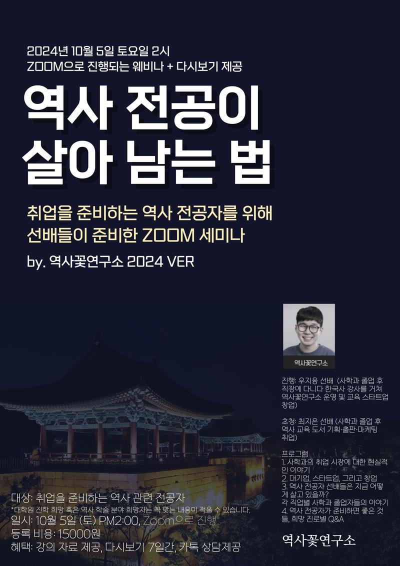 역사 전공자는 많지만, 역사 쪽 전공을 살릴 수 있는 진로는 많지 않습니다.사학과를 나와서 대기업과 스타트업에 다니고, 또 교육 분야 창업도 경험하며 사학과 후배들이 미래를 조금 더 잘 그릴 수 있도록 도움을 줄 수 있는 온라인 세미나를 준비했습니다.이번에 4회차를 맞게 되었으며, 더 여러 이야기를 들려드리기 위해 역사 콘텐츠 기획/출판/마케팅 분야 업무 중이신 최지은 선배도 함께 모시고, 추가 내용을 보충해서 라이브로 진행됩니다.