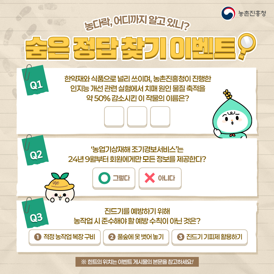 '숨은 정답 찾기' 이벤트 게시물에 각 문제의 번호와 정답을 함께 남겨주세요!