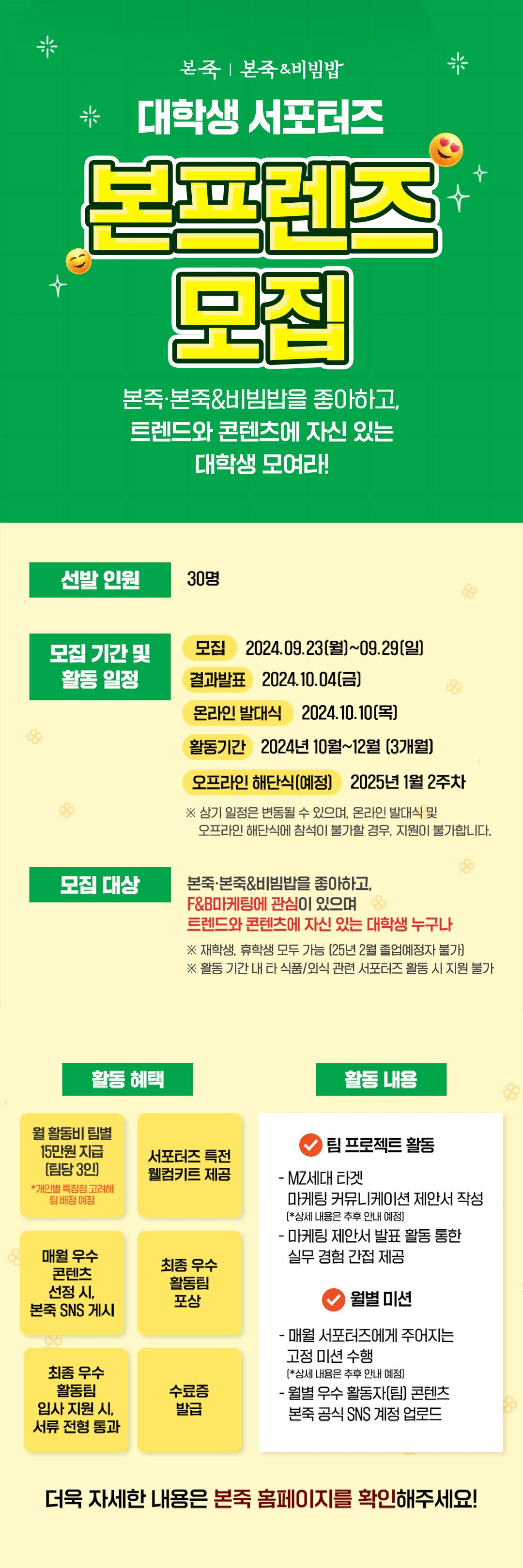 • 본죽·본죽&비빔밥을 좋아하고, F&B마케팅에 관심이 있으며 트렌드와 콘텐츠에 자신 있는 대학생 누구나