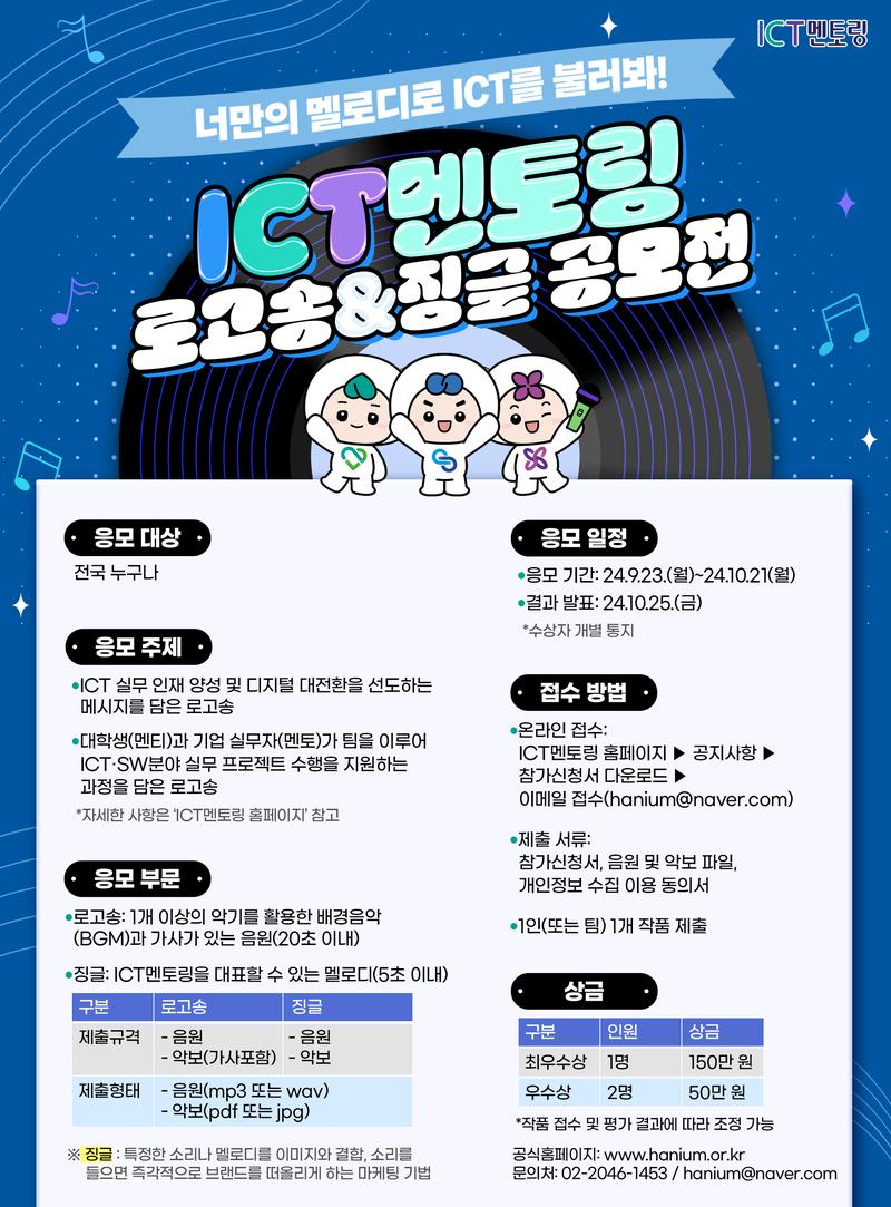ICT멘토링 로고송 및 징글 공모전을 9월 23일(월)부터 10월 21일까지 개최하오니,