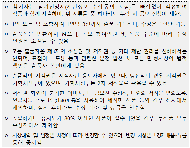 ※ 응모작은 순수 창작 영상물이어야 하며, 「경제배움e+」 누리집의 콘텐츠 중 제작기관이 '기획재정부'/'KDI'/'기획재정부/KDI'인 자료에 한하여 필요시 활용할 수 있습니다.