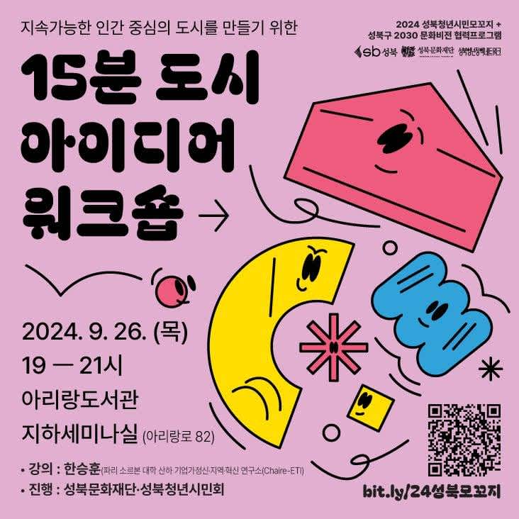 성북문화재단과 성북청년시민회에서는 지속 가능한 인간 중심 도시를 만들기 위해, '15분 도시' 개념을 적용한 워크숍을 진행하려고 합니다. 이 워크숍에서는 개인의 일상과 가까운 곳에서 주거, 생활, 일자리, 건강, 교육, 여가 등 다양한 요소를 통합하여 질 높은 서비스를 설계하고, 모두가 살고 싶은 더 나은 도시를 만드는 아이디어를 함께 모색할 것입니다.