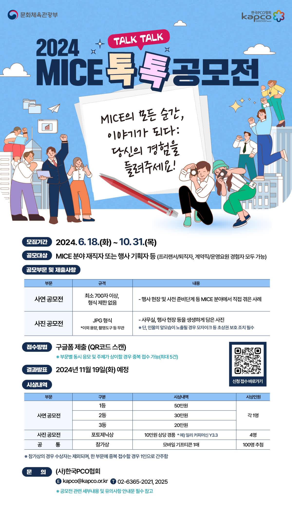 문화체육관광부와 (사)한국PCO협회는 'MICE의 모든 순간, 이야기가 되다' 주제로 2024 MICE 톡톡(TALK TALK) 공모전을 진행합니다.