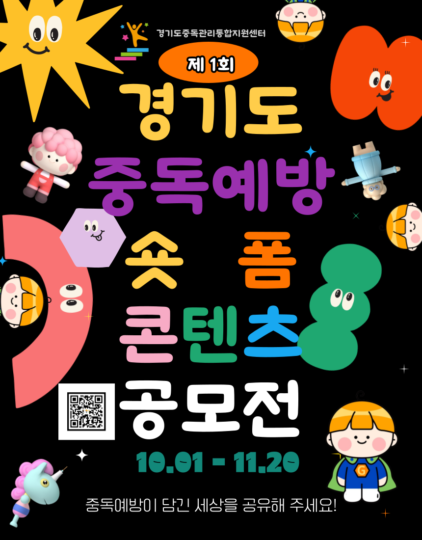 공모 양식 | ① 경기도중독관리통합지원센터 숏폼 가. 주제 - 중독 예방 나. 주제 내용 - 중독 예방&회복 중독 특성이 잘 담겨진 내용 - 꿋꿋하게 회복을 이어나갈 수 있는 내용 - 경기도민이 공감과 쉽게 이해하고 기억에 남는 내용 - 경기도민의 함께 소통하고 회복할 수 있는 내용 - 어렵고 힘든 일을 겪었지만, 때론 실패해도 꿋꿋하게 회복하고 성장하는 내용 - 중독 및 예방 특징을 잘 나타낼 수 있는 기발한 내용 - 중독예방을 잘 표현하는 참신하고 기발한 내용 - 짧고 간결하지만, 여운이 남는 내용 - 중독예방 및 회복에 어울리는 함축적이고 잘 표현된 내용 - 독특하고 차별화된 내용으로 공감을 얻을 수 있는 내용 - 중독이라는 어둡고 무거운 표현 대신 밝고 긍정적인 내용 다. 형식: 순수 창작물 - 유튜브 - 인스타그램 - 틱톡 - 그 외 SNS 영상 라. 개인 SNS 업로드 후 유지 ※필수 마. 해시태그 (아래 항목 모두 기재) ※필수 #경기도 #경기도중독관리통합지원센터 #중독예방 #지킴이 바. 기타 - 캐릭터 및 슬로건 이용 시 가산점 부여 |