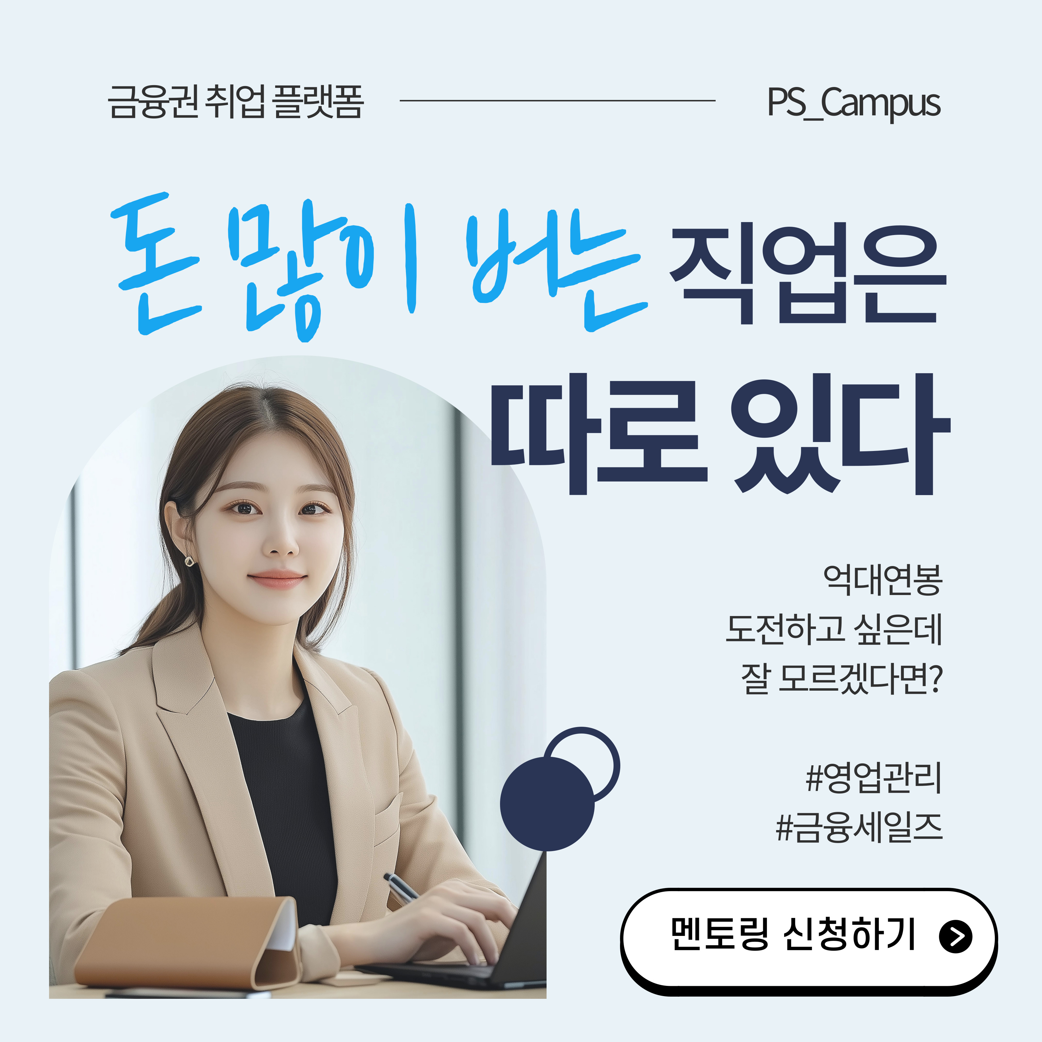 여러분의 열정을 현실로 만들어줄 멘토링 프로그램을 시작합니다! 금융 세일즈 분야에서 진정한 전문가로 성장할 수 있는 기회를 드립니다.
