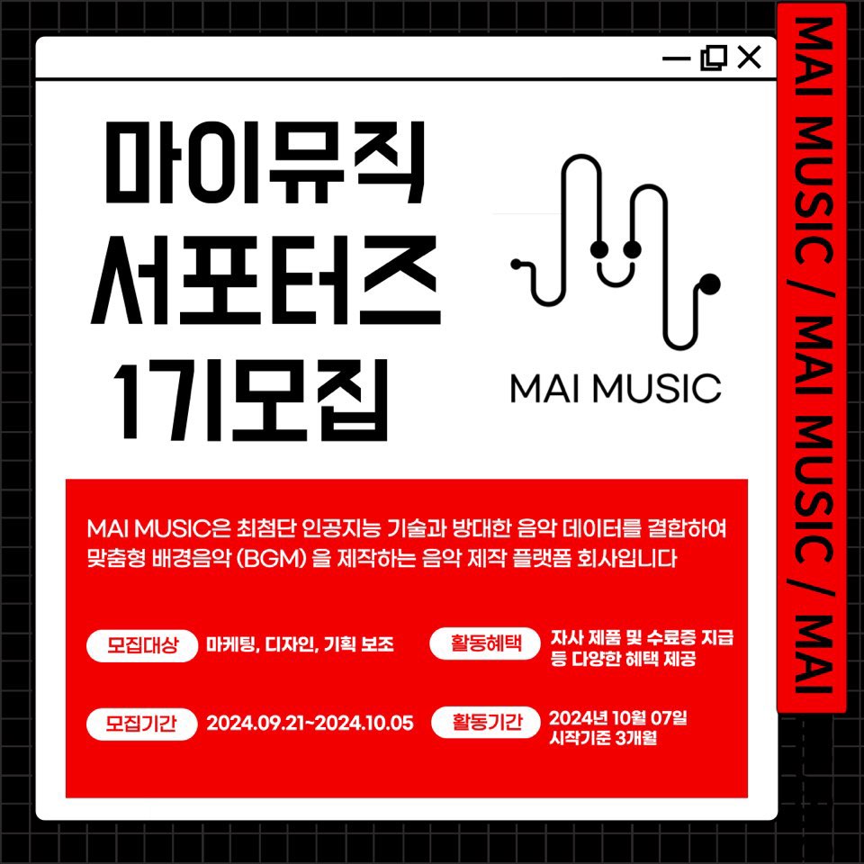 โข MAI MUSIC์ ๊ณต์ ์ฑ๋์์ ๋ณธ์ธ์ ์ฝํ ์ธ ๋ฅผ ์๊ฐํ ๊ธฐํ ์ ๊ณต